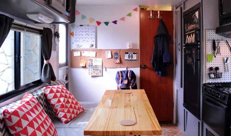 But the Surveyor Travel Trailer wasn’t exactly decorated to Heather and Dana’s taste.“It was the classic wood veneer cabinetry and ugly wallpaper. It was livable for a weekend, and thankfully all of the appliances were in good shape. But we wanted more. We started out doing a couple small projects, and kept realizing new potential for this little place and ended up nearly redoing it all.”