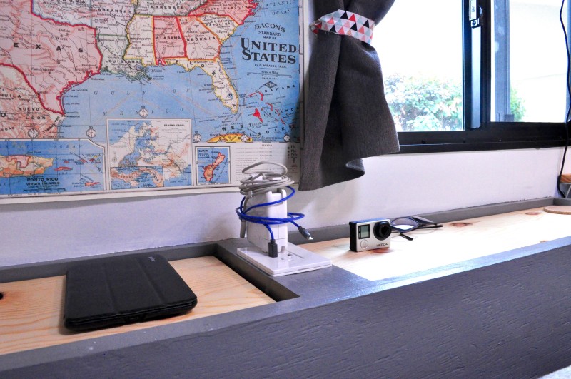 In the middle of the storage area, there’s a built-in outlet that also has USB ports.
