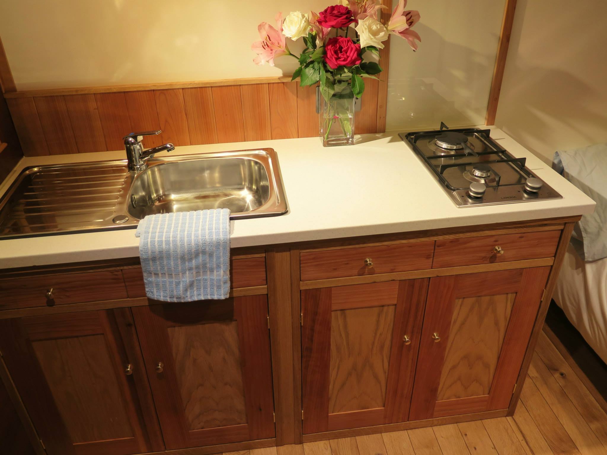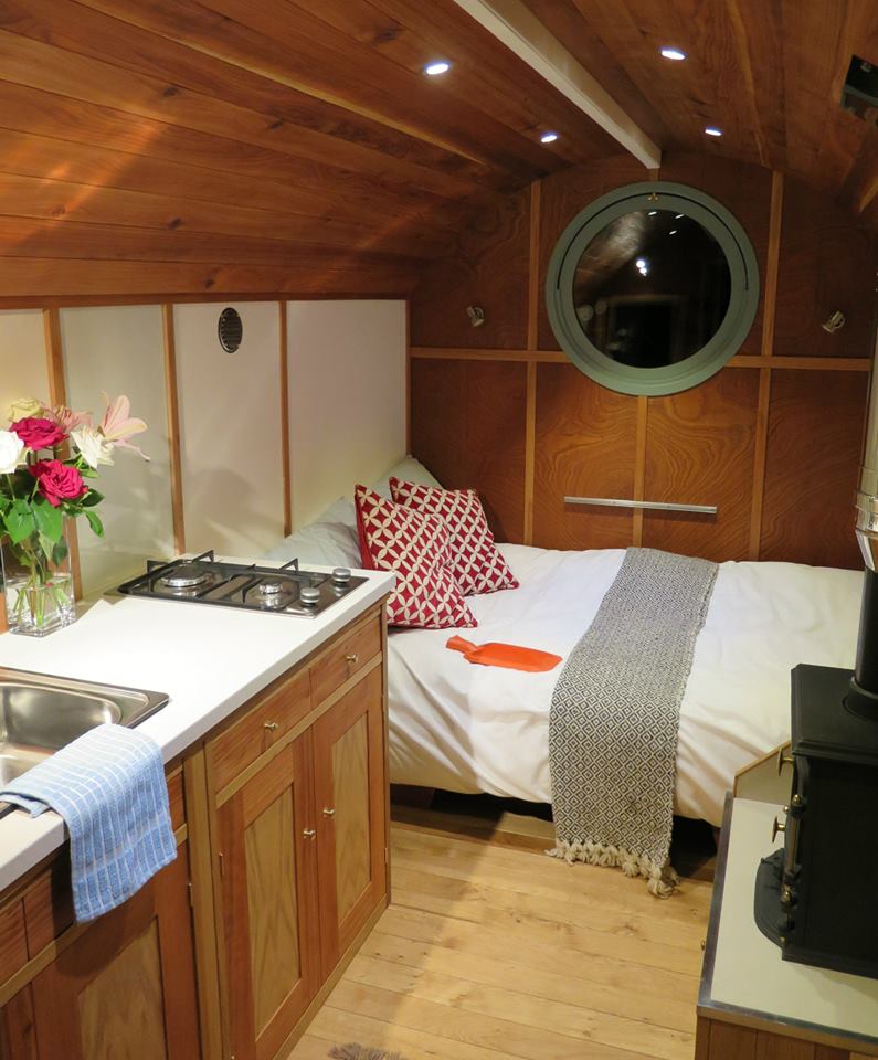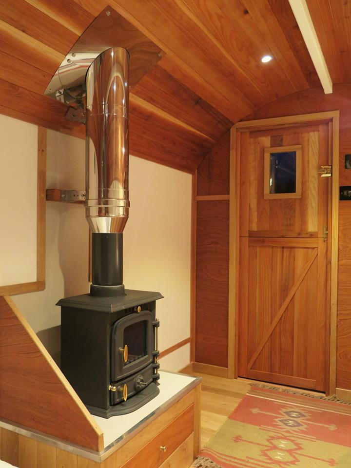 The bow top structure is built-up of laminates glued together using state of the art structural engineering glue. The walls are 50mm thick. Bella is fully insulated in floor, walls and ceiling and has a waterproof breather membrane for added protection. The external timber has been treated with 2 coats of UV resistant Osmo oil that will maintain the natural colour of the wood. It has a microporous finish which does not crack, flake, peel or blister. Also, it is dirt resistant and moisture regulating. The internal wood is treated with 2 coats of Danish oil protecting, nourishing and ‘feeding’ the wood from the inside. It has excellent long-term protective properties and a delectable finish. The floor and table have Osmo hard wax oils which are hard wearing and durable. The walls, floor and ceiling have been glued with professional adhesive to add extra rigidity.