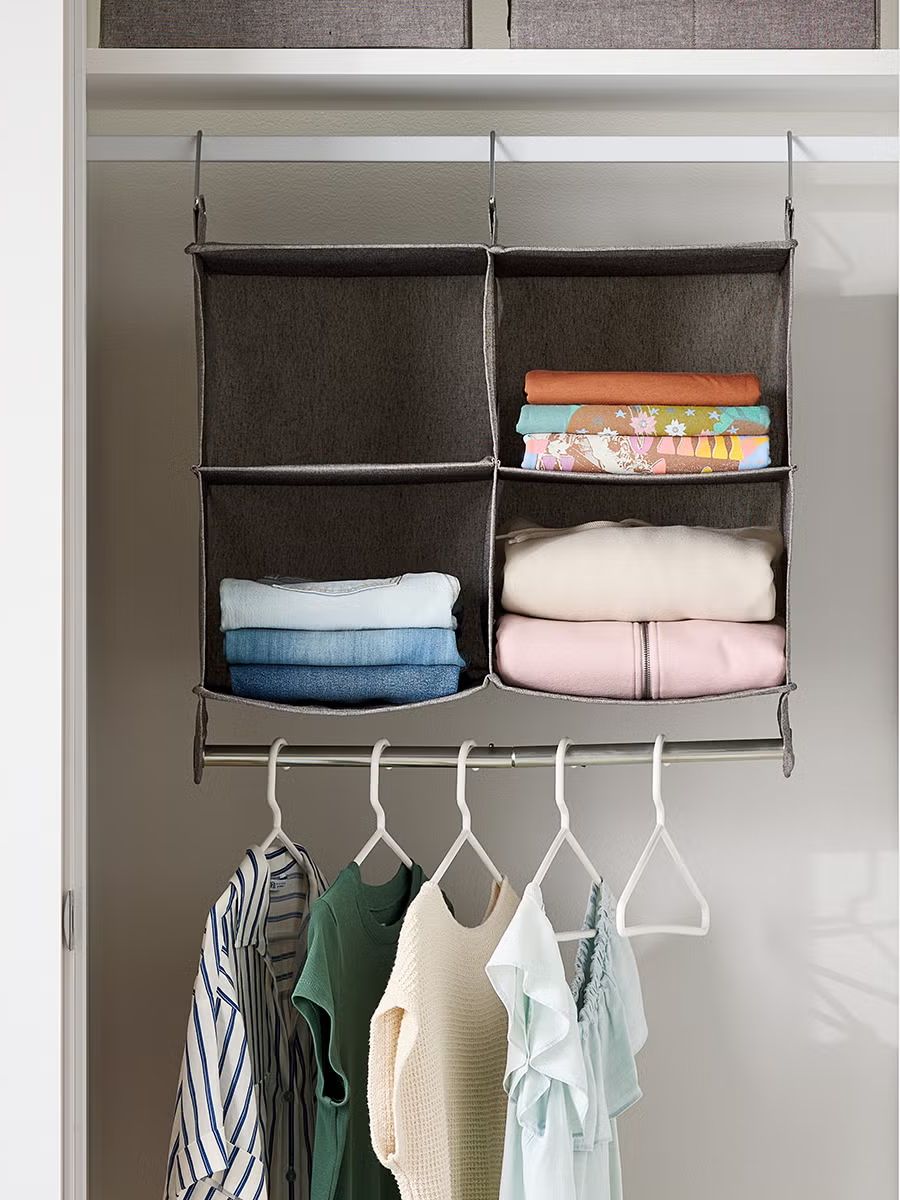 Slide it over your closet rod and instantly gain four fabric shelves plus a lower hanging bar. It’s lightweight but holds up to 11 pounds — perfect for apartments with one (very) hardworking closet that needs to do more.
