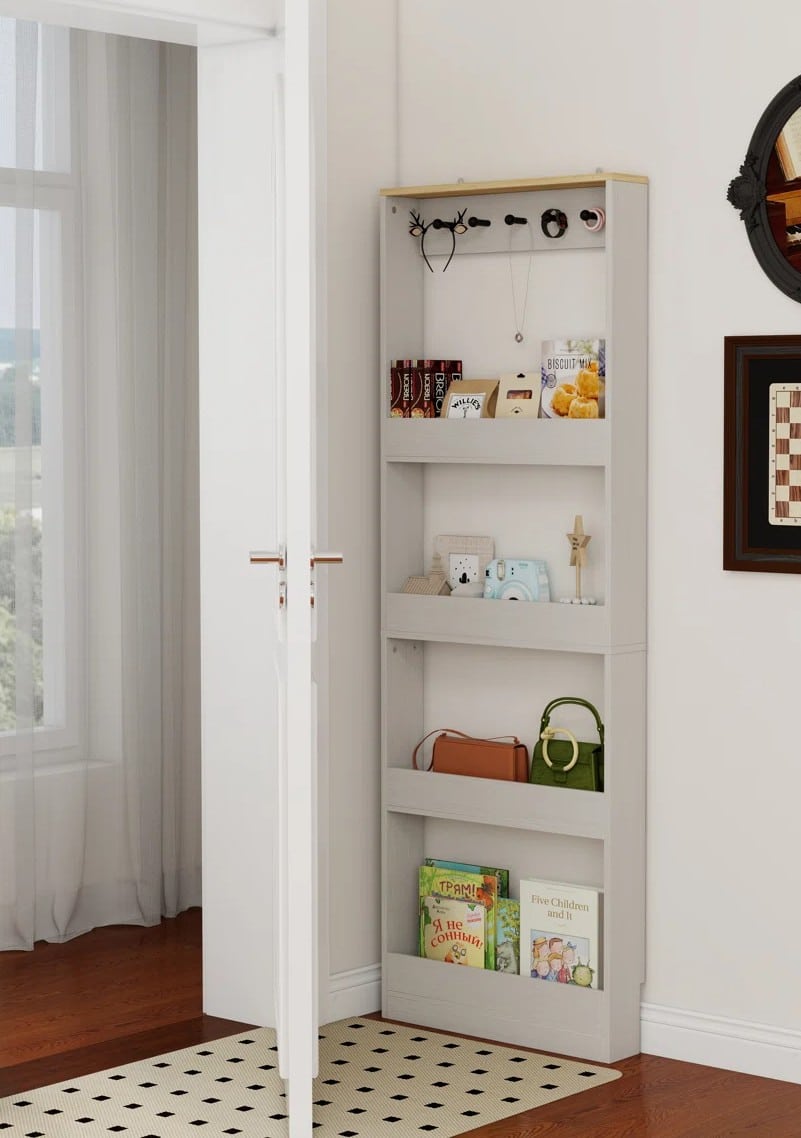 Only 4.7 inches deep, this ultra-slim cabinet is made for those awkward behind-the-door spaces. With four shelves, five hooks, and enclosed bottom storage, it maximizes vertical real estate without overwhelming a room. Adjustable shelves let you customize for toiletries, books, or snacks, and the antique white finish keeps it feeling light.