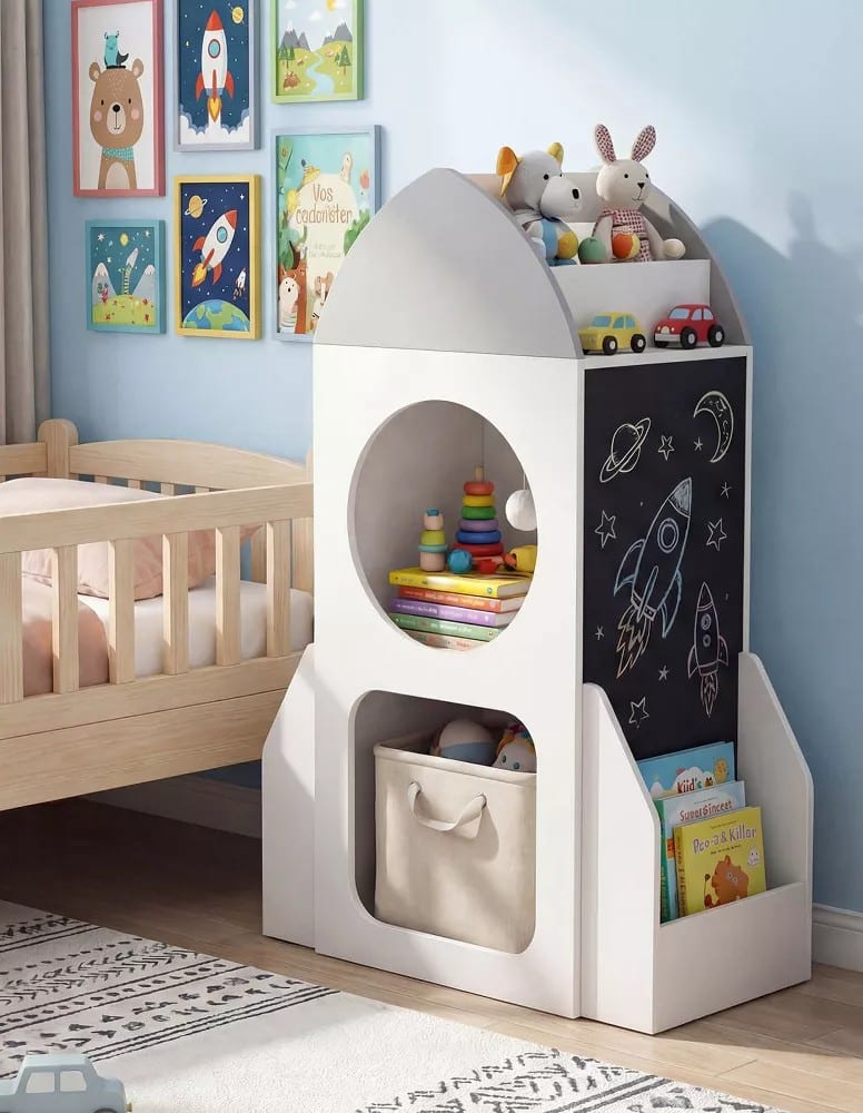 Whimsical and practical, this rocket-shaped unit has five storage areas plus chalkboards on both sides. Child-friendly height and anti-tip features make it ideal for small bedrooms or play corners where storage still needs personality.