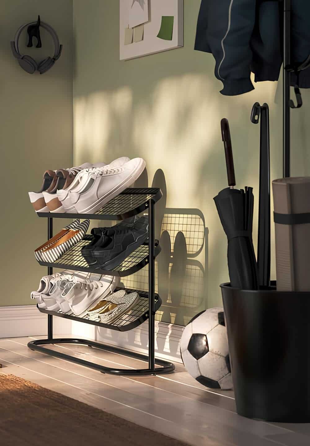 Slim and airy, this powder-coated black rack holds up to 12 pairs of shoes. The shelves can tilt diagonally to save even more space. Ideal for narrow hallways that can’t spare an inch.