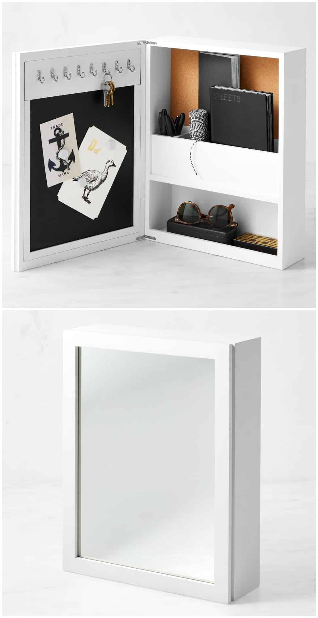 Mirror on the outside, command center inside. With compartments for mail, cork and magnetic boards, and eight hooks, this wall-mounted piece replaces cluttered entry tables entirely. It’s especially good in apartments where the “entryway” is just a stretch of wall.
