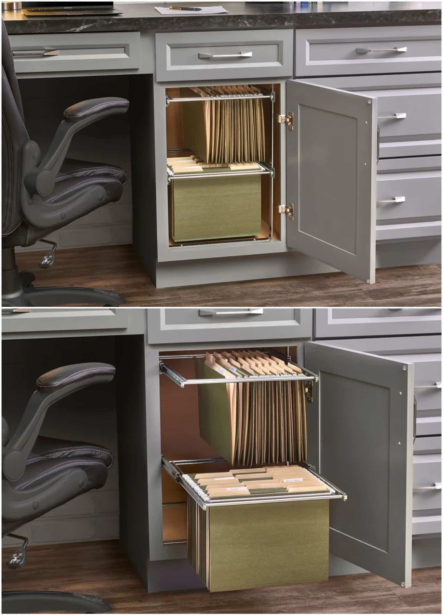 Turn a standard cabinet into a two-tier file drawer with full-extension ball-bearing slides. It holds both letter and legal folders and mounts to the cabinet floor. Perfect for small home offices or kitchens that double as admin zones.