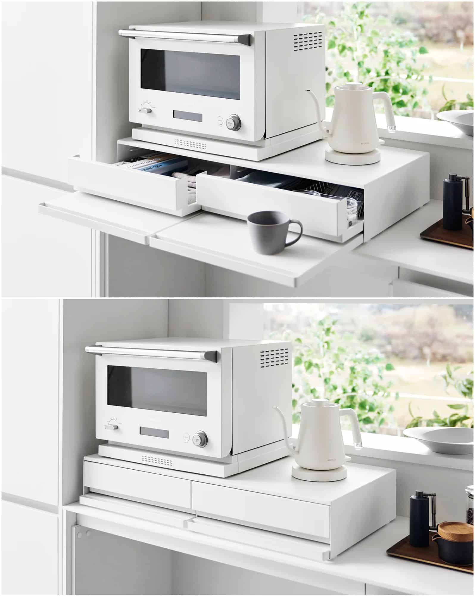 This under-appliance drawer elevates your coffee maker and adds hidden storage beneath. Both sides feature pull-out shelves for mugs or prep space. It’s a serious countertop upgrade for tiny kitchens where every inch matters.