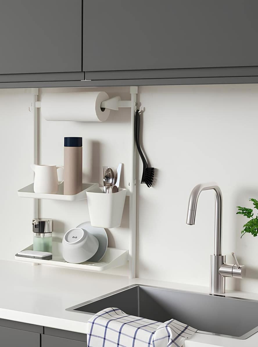 No drilling required. This modular rail system adds shelves, containers, and a paper towel holder wherever you need them. It’s small-space gold when every centimeter counts and cabinets are already maxed out.
