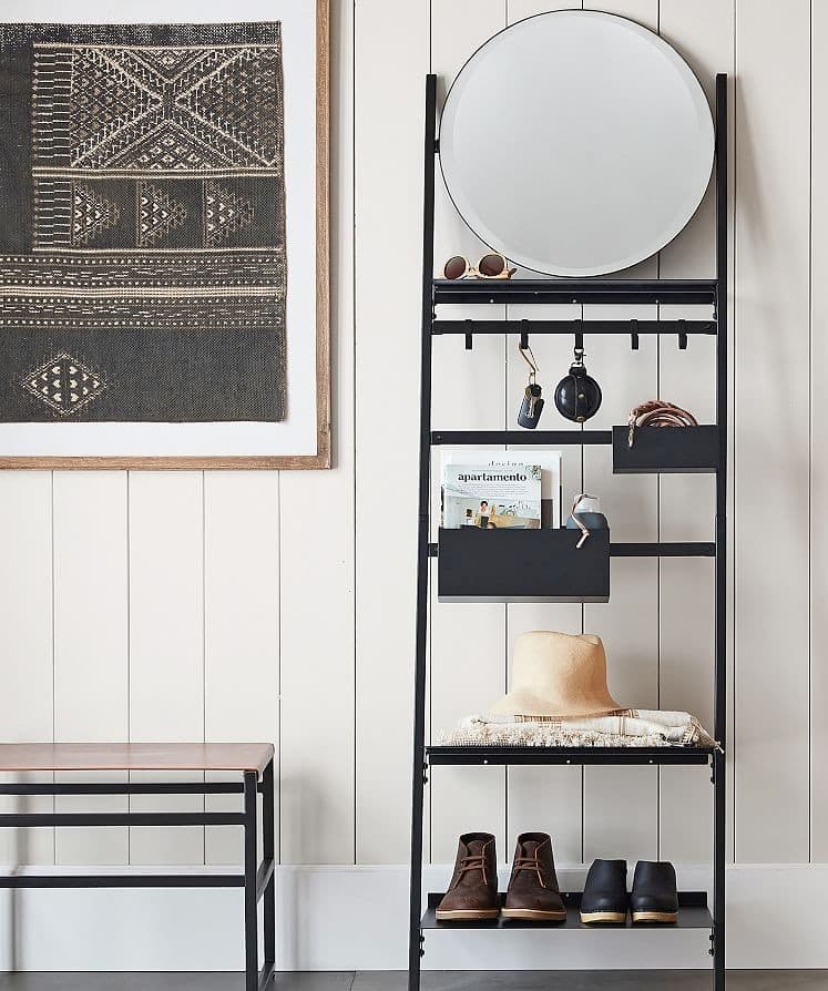 Part mirror, part command center, this matte black steel organizer is ideal for entryways that don’t technically exist. Hooks, shelves, storage containers — it’s all built in. The beveled mirror tilts, making last-minute outfit checks easy. It’s vertical storage at its smartest, especially in tight apartments.