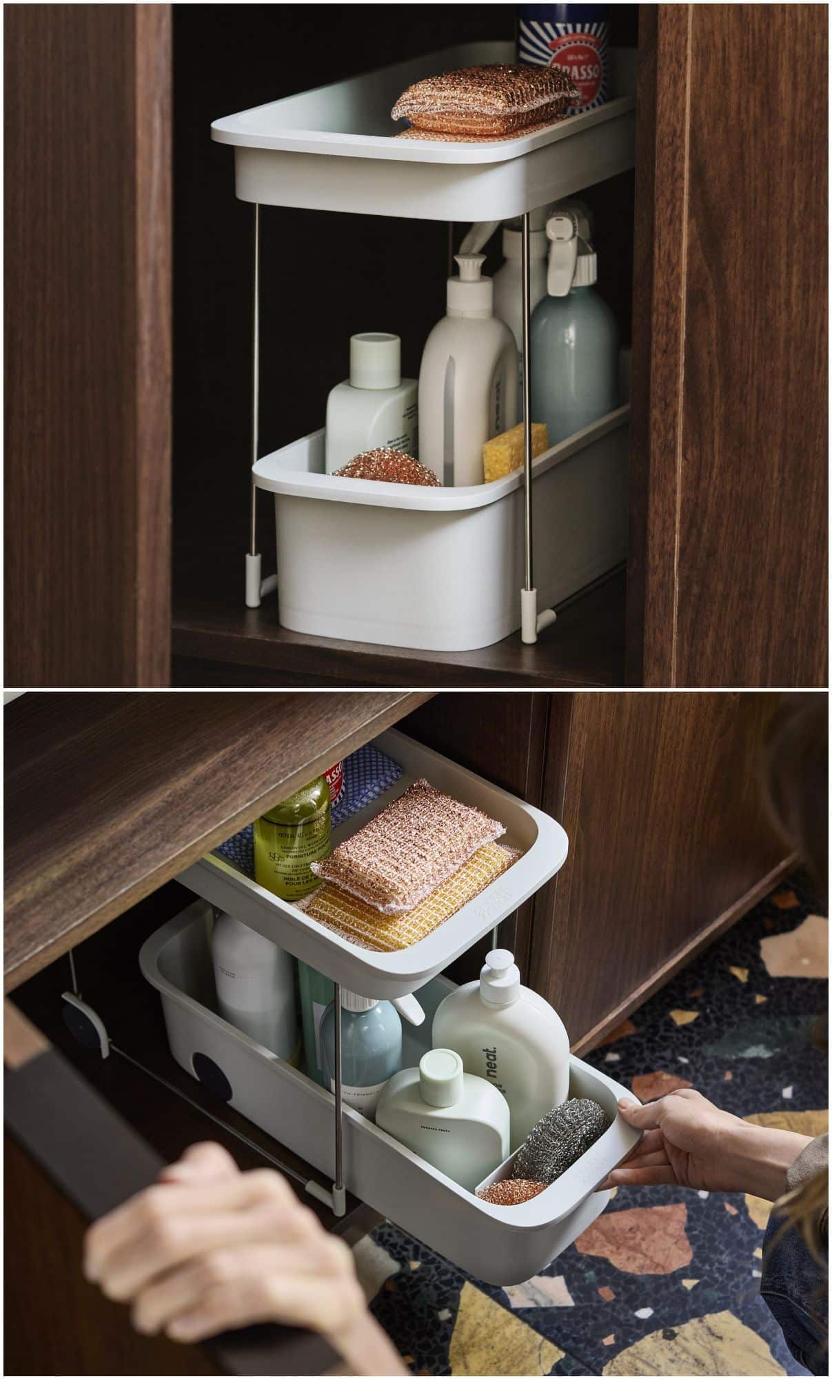 Two tiers, rolling wheels, and pull-out handles make this cupboard caddy incredibly easy to use. It’s especially perfect under sinks where cleaning supplies tend to pile up and disappear into the back corner.