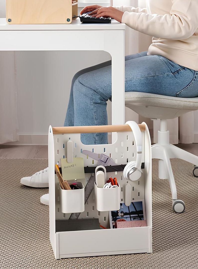 Portable, pegboard-backed, and endlessly flexible. One side holds a laptop with an elastic strap, the other stores smaller essentials. Perfect for switching between dining table and desk without losing your workflow.
