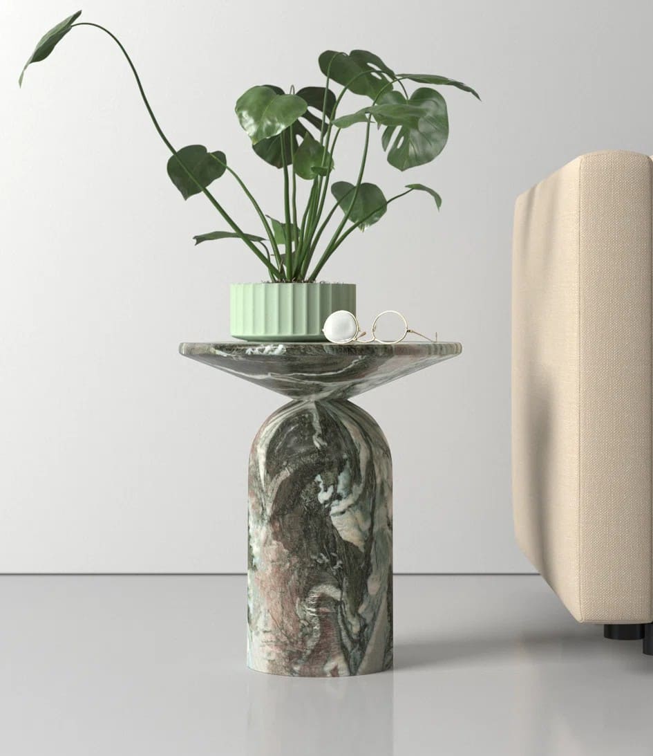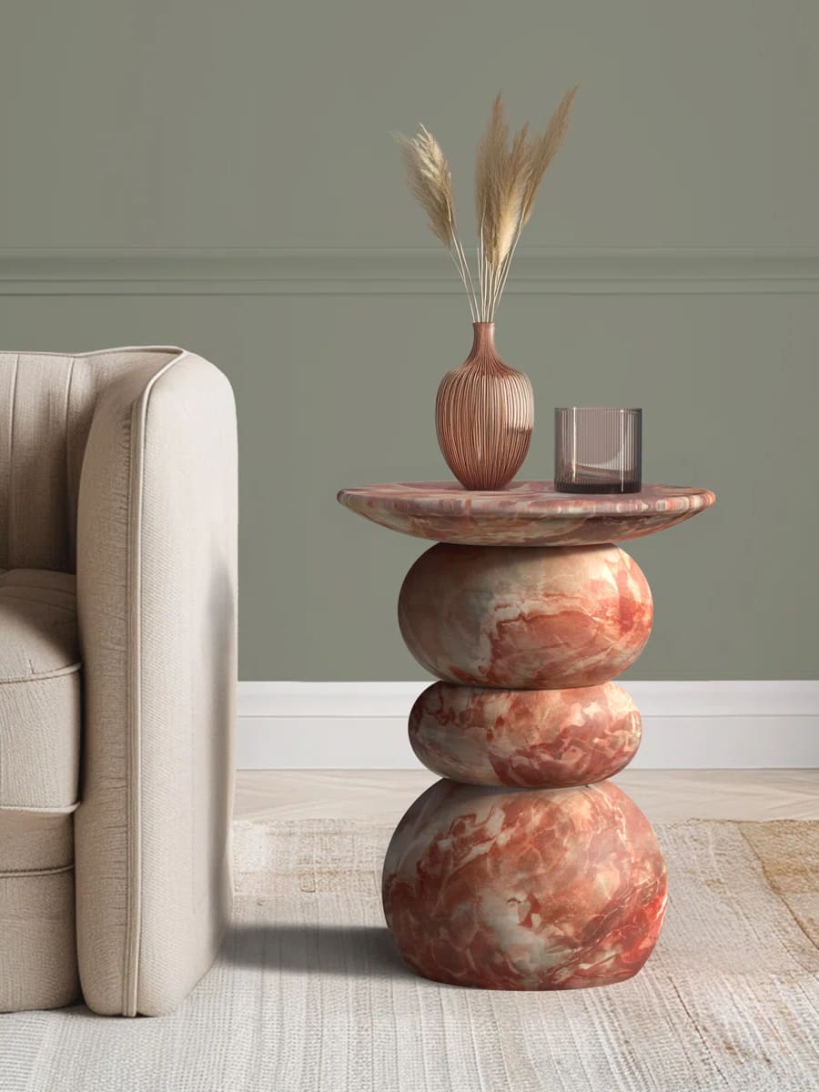 Equal parts side table and sculpture, the Stephanos Effect piece brings a faux-travertine finish and weatherproof durability. Its stool-like form works indoors or out, whether next to a sofa, on a patio, or tucked into a garden corner. Compact but impactful, it offers versatile use as a stool, accent, or functional surface—no assembly required.