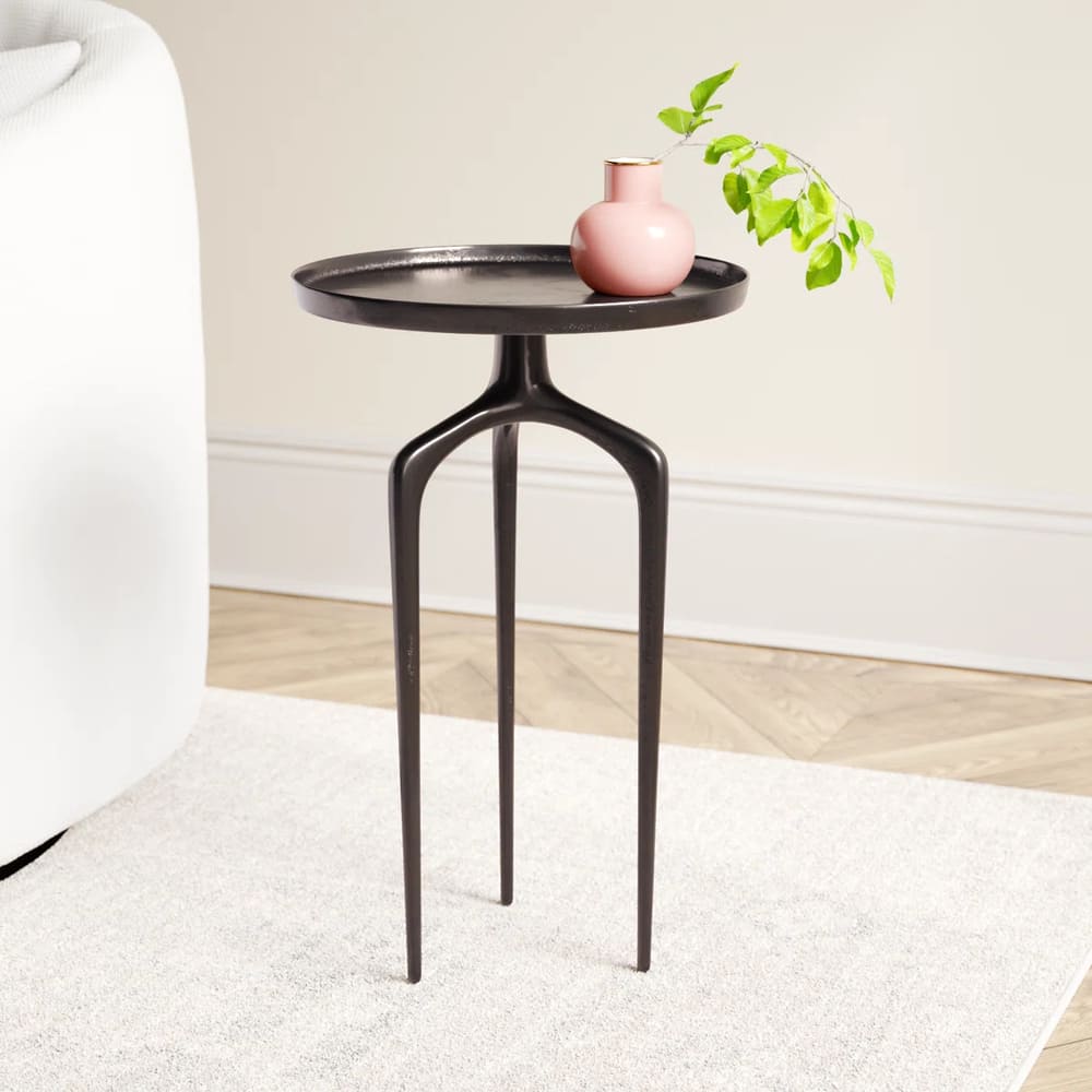 With its tripod base and raised-edge tray top, the Jody end table delivers both personality and practicality. Crafted from solid aluminum with a striking black finish, it’s lightweight yet durable, making it an easy addition to any room. The sleek lines and sculptural silhouette bring a contemporary touch, whether styled with a planter, lamp, or glass of wine.
