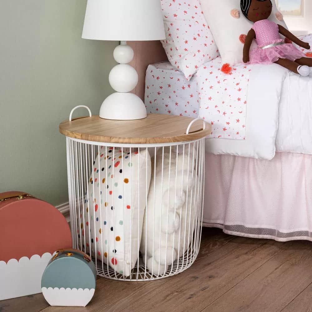 Smart storage that multitasks is always a win—especially in smaller homes. This wire bin comes with a wooden lid, instantly transforming it into a side table while keeping whatever’s inside neatly out of sight. It’s perfect for kids’ rooms, but honestly stylish enough to use anywhere you need a little extra hidden storage.