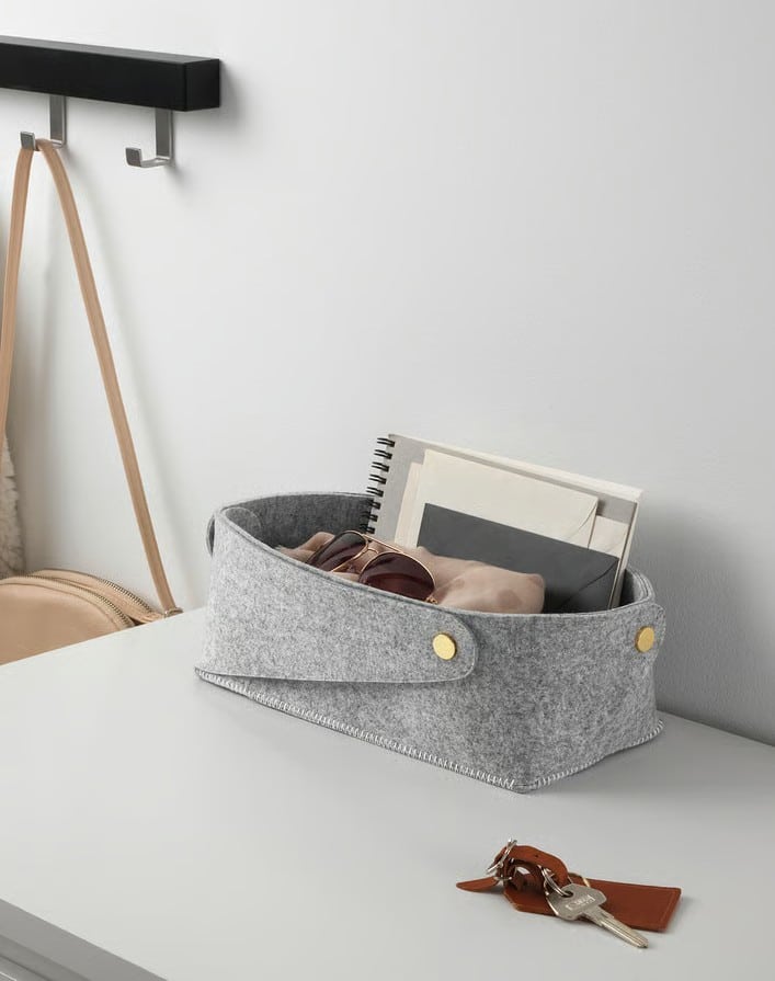 Soft, foldable, and finished with a subtle brass button detail, this felt basket is ideal for organizing smaller items without adding bulk. It fits neatly into shelving units, making it a great option for keeping things tidy in tight spaces.