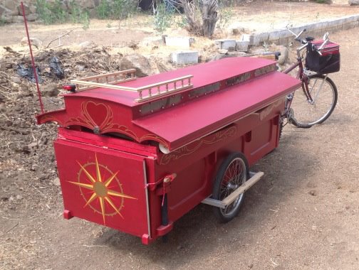 About 80 % of the materials Barry Howard used for his small gypsy caravan are recycled and repurposed. The aluminium that makes up the chassis and framing for the port-side wall came from an old broken pop-up craft fair booth, as did most of the screws and bolts. The hitch came off a church organ that he dismantled, the wheels from his folding bicycle, the rear stabilizing legs came from a camera tripod he cannibalized, and the fabrics and much of the wood came from his recently deceased minivan camper.