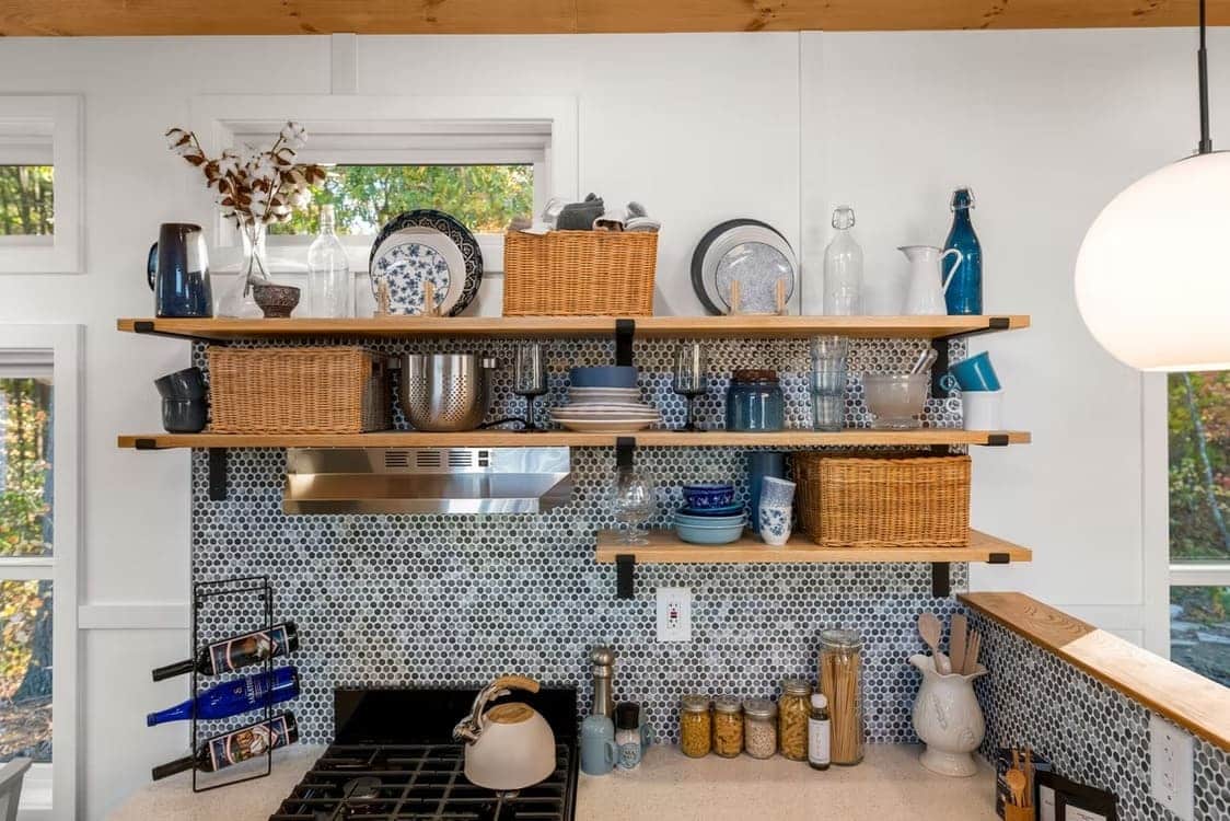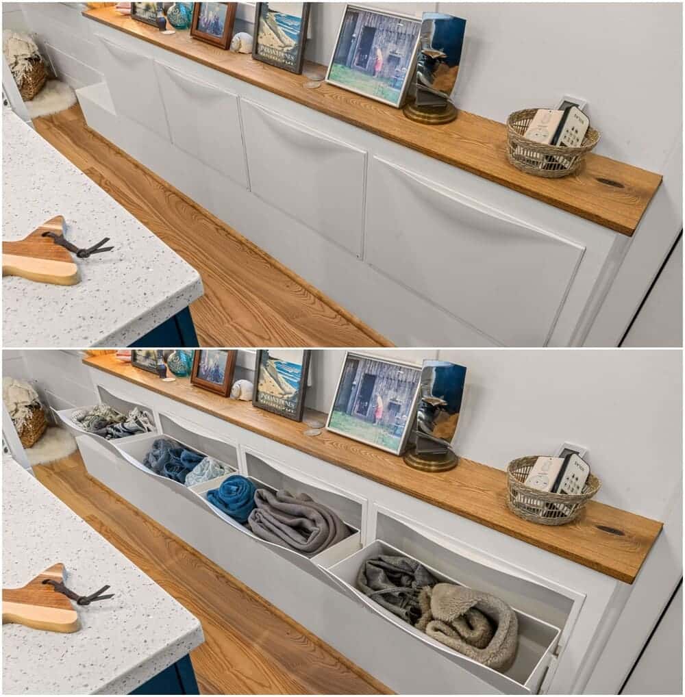 The designers at Backcountry Tiny Homes made storage a primary consideration during this build. Alongside a storage loft, there are also tip-out bins in the entryway for everyday essentials. Painted white, they blend into the walls and take up limited functional space.