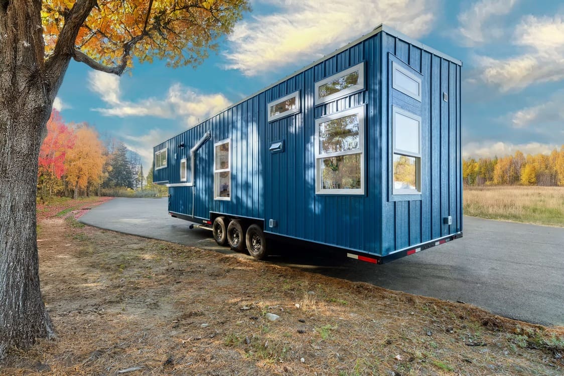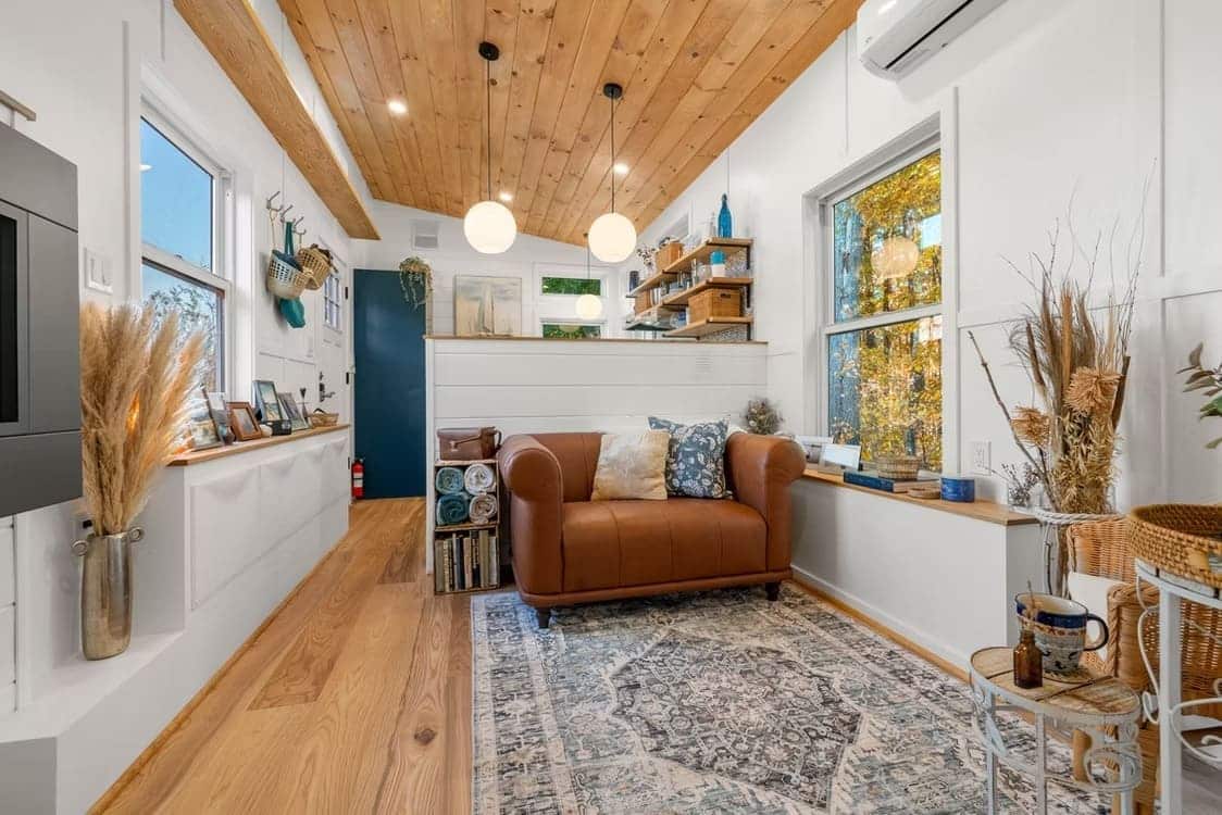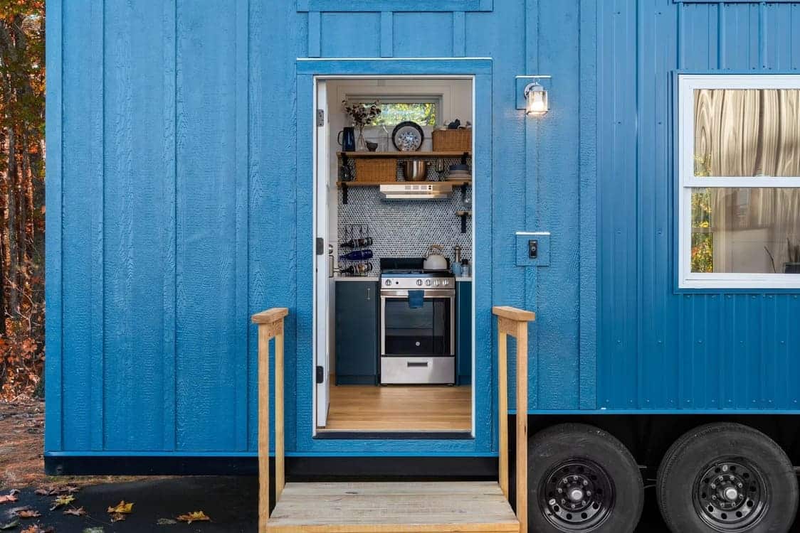 This vibrant blue gooseneck-style tiny home features metal and board-and-batten siding with striking white windows. No matter where you set it up – be it at the beach or in an urban area – it can’t help but turn heads.