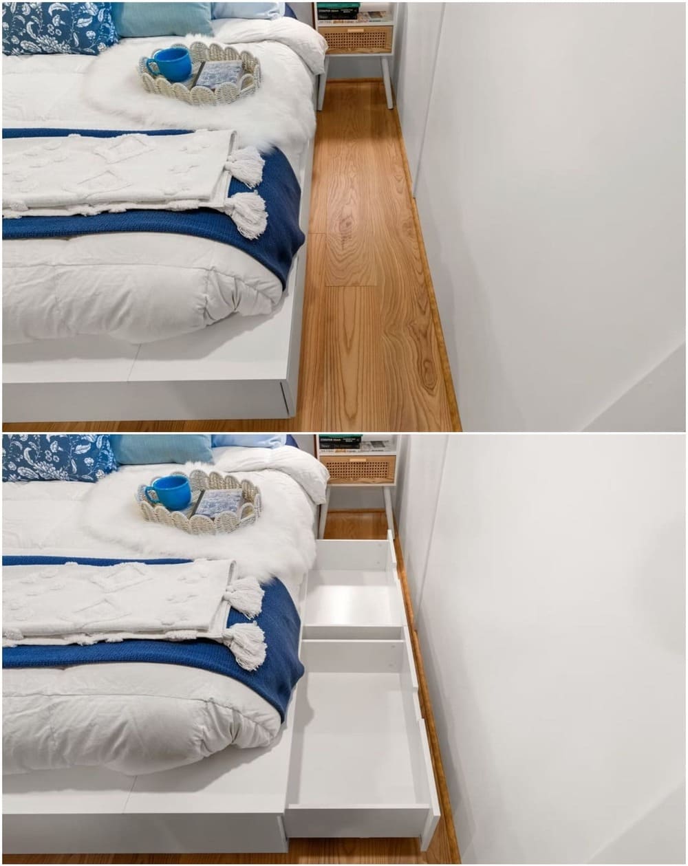 The king-size mattress sits on a convenient storage base, with pull-out drawers accessible from the sides. There is also enough room next to the bed for a nightstand with storage.