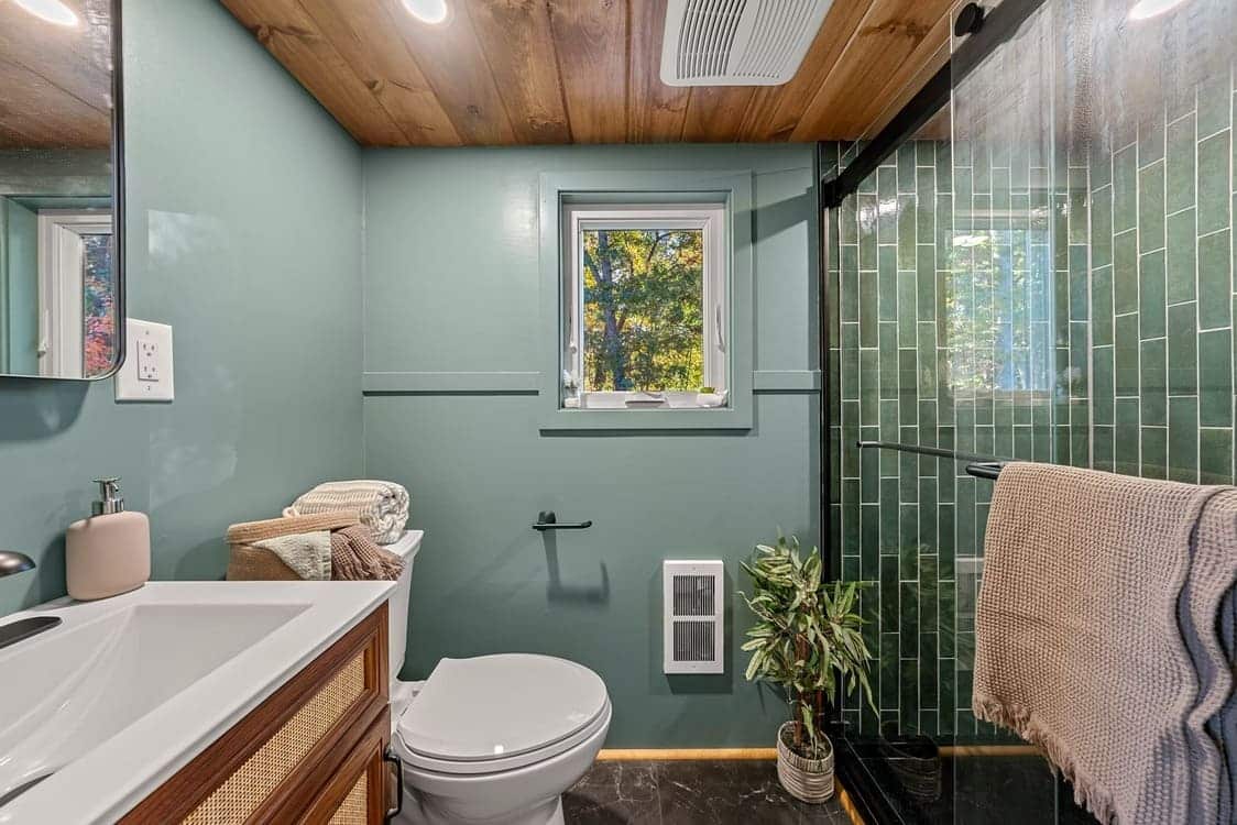 A gorgeous bathroom with a coastal color scheme lies adjacent to the living area, below the bedroom loft. It has a plumbed toilet with a hot water connection for a future bidet. Off-grid appliances are optional.