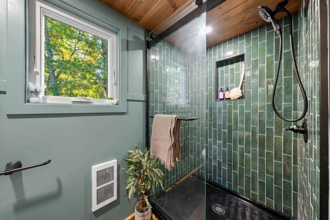 The bathroom is well-planned and luxurious. The color scheme is warm and fresh, and it pairs well with the gorgeous shower, featuring porcelain tile walls, a handheld shower head, a sliding door, and a generous 48-inch pan.