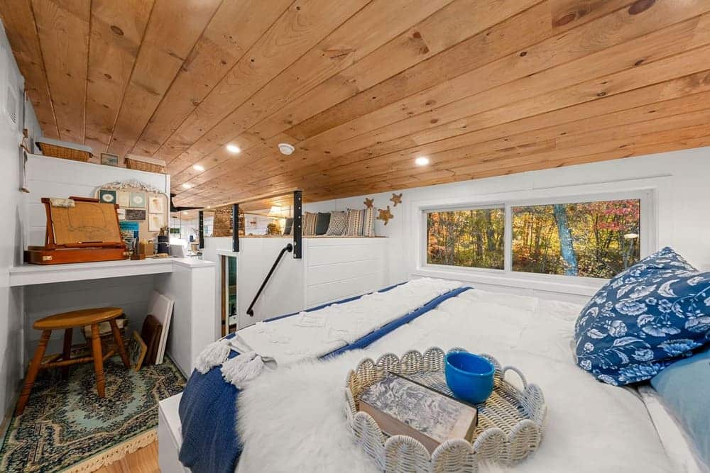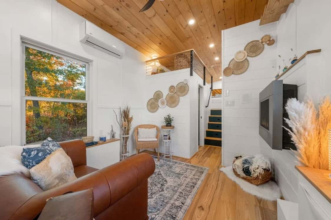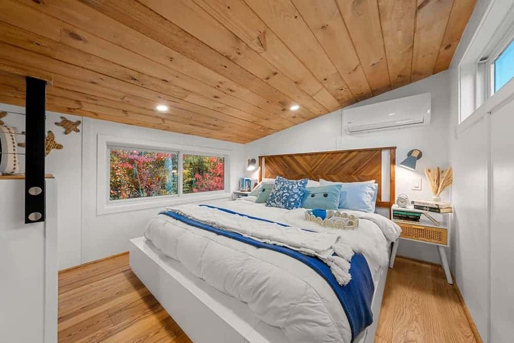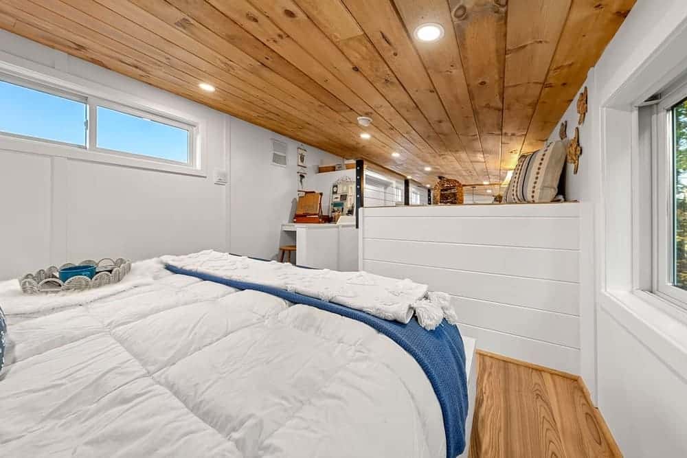 This tiny home leans into its seaside inspiration with an airy, relaxed aesthetic and a layout designed for real-life comfort. Inside, you’ll find all the essentials: a functional kitchen, a full bathroom, and a standing-height bedroom loft that feels more like a cozy retreat than a cramped nook. Clever storage solutions keep everything tidy, so the space stays calm and clutter-free.