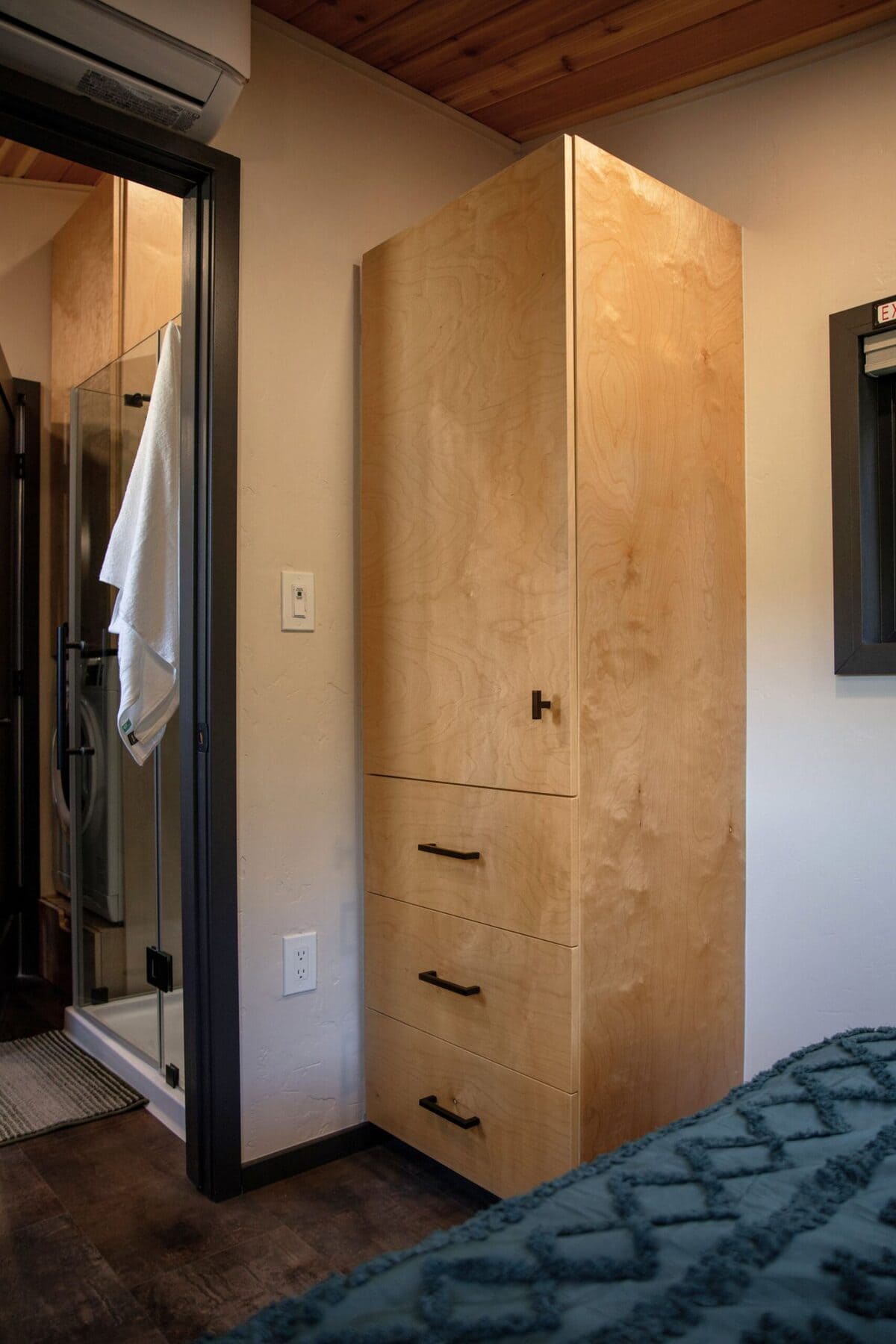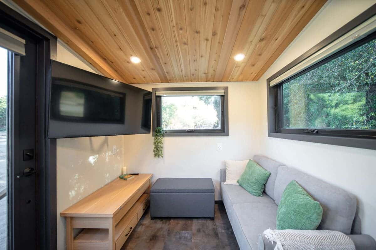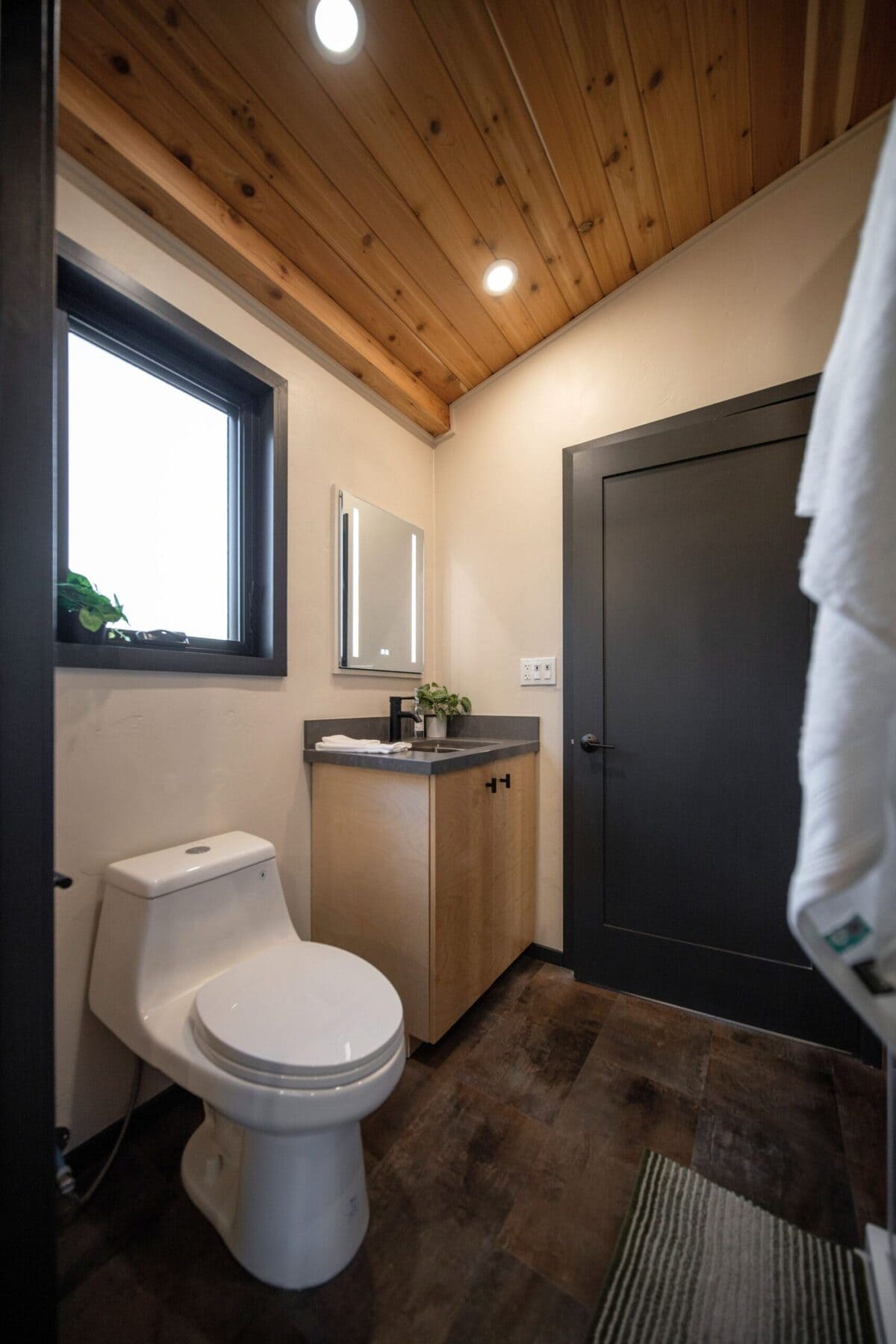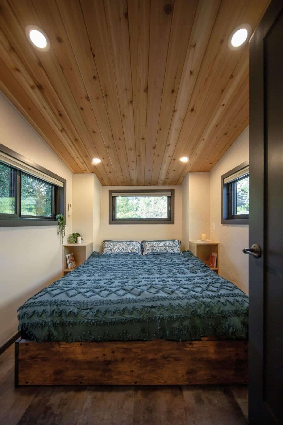 It’s the small details that make the biggest difference, too. Piccola Tiny Homes installed a humidity-sensing automatic exhaust fan to limit moisture buildup. Finally, the cedar ceiling ties this space’s design in with the rest of the home.