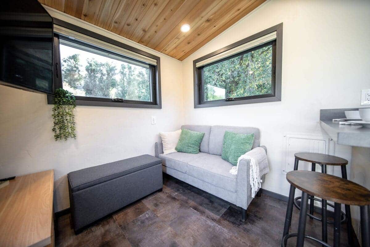 Natural light plays a big role in the overall feel of the space. Inside, there’s a separate downstairs bedroom, an unusually spacious bathroom, and a kitchen that functions much like one you’d find in a small apartment rather than a scaled-down tiny house version. At 30 feet long, 8.5 feet wide, and 13 feet high, the home offers 265 square feet of living space, with the option to go wider at 10 feet if you’d like a little more breathing room.