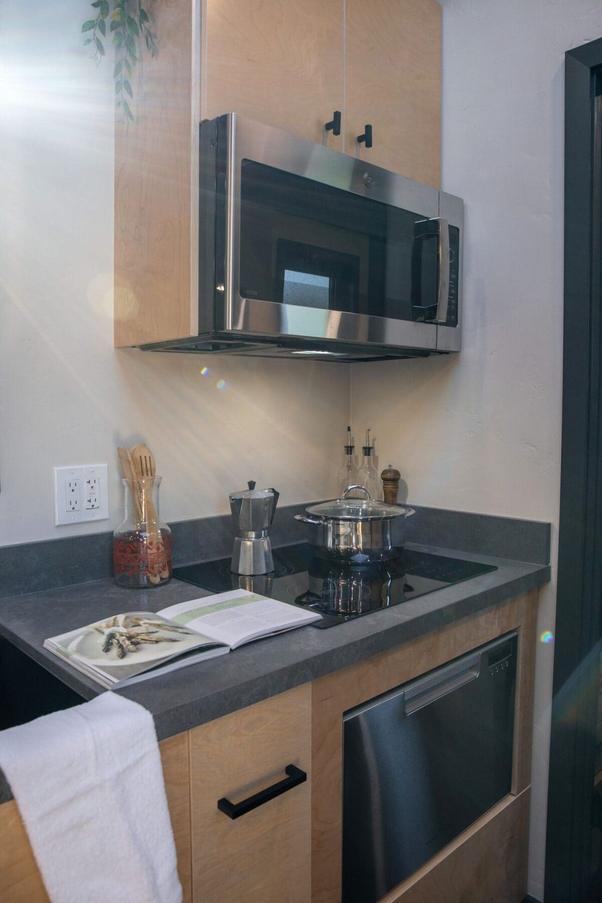 Alongside generous benchspace, cabinetry, and quality appliances, it also has a mini-split positioned above the kitchen window for comfort as you cook, socialise, and entertain. This unit is part of the dual-zone heating and cooling setup, which you’ll also find in the bedroom.