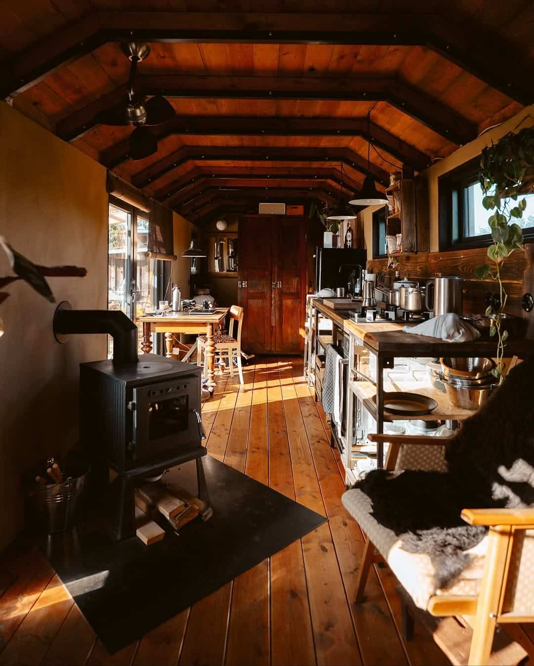 The stove also doubles as a cooking and baking tool, supporting everyday rituals like making bread, soup, and hot drinks through the colder months. Built from cast iron and heavy firebricks, it distributes heat evenly and retains warmth long after the fire has died down, reducing wood consumption and keeping the space comfortable overnight. Installed against a carefully constructed fireproof wall, it reflects the same safety-first, long-term thinking that defines the rest of the build.