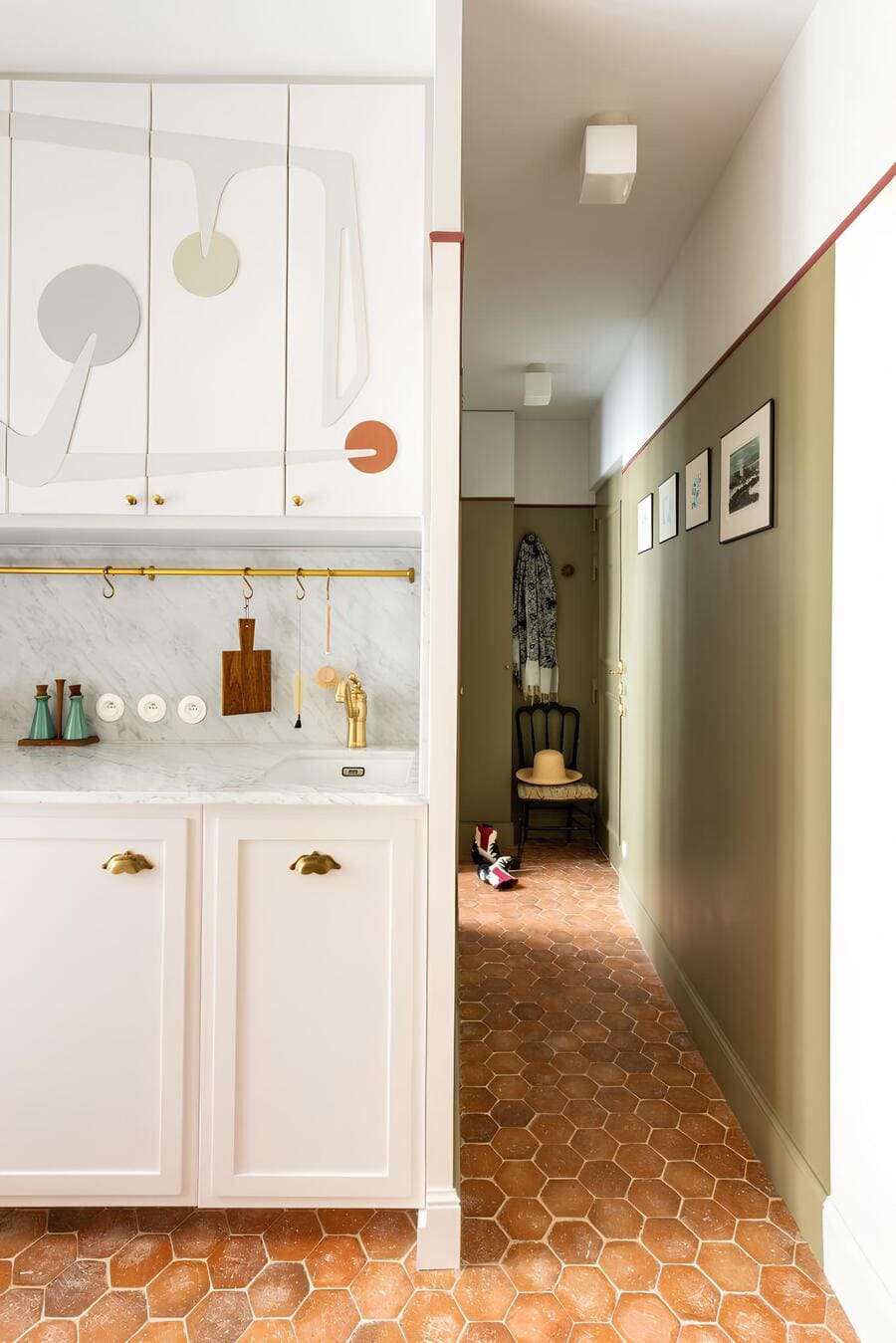 The terracotta floor tiles come from a century-old workshop that still uses traditional kilns. The zellige tiles are handmade in North Africa. Fabrics are woven in an African village, and a vegetable-fiber pendant light floats overhead. There’s a cardboard frame crafted by a friend, mid-century ceramics that carry the hand of their makers, and heritage wallpaper techniques that revive the art of dominoté paper.