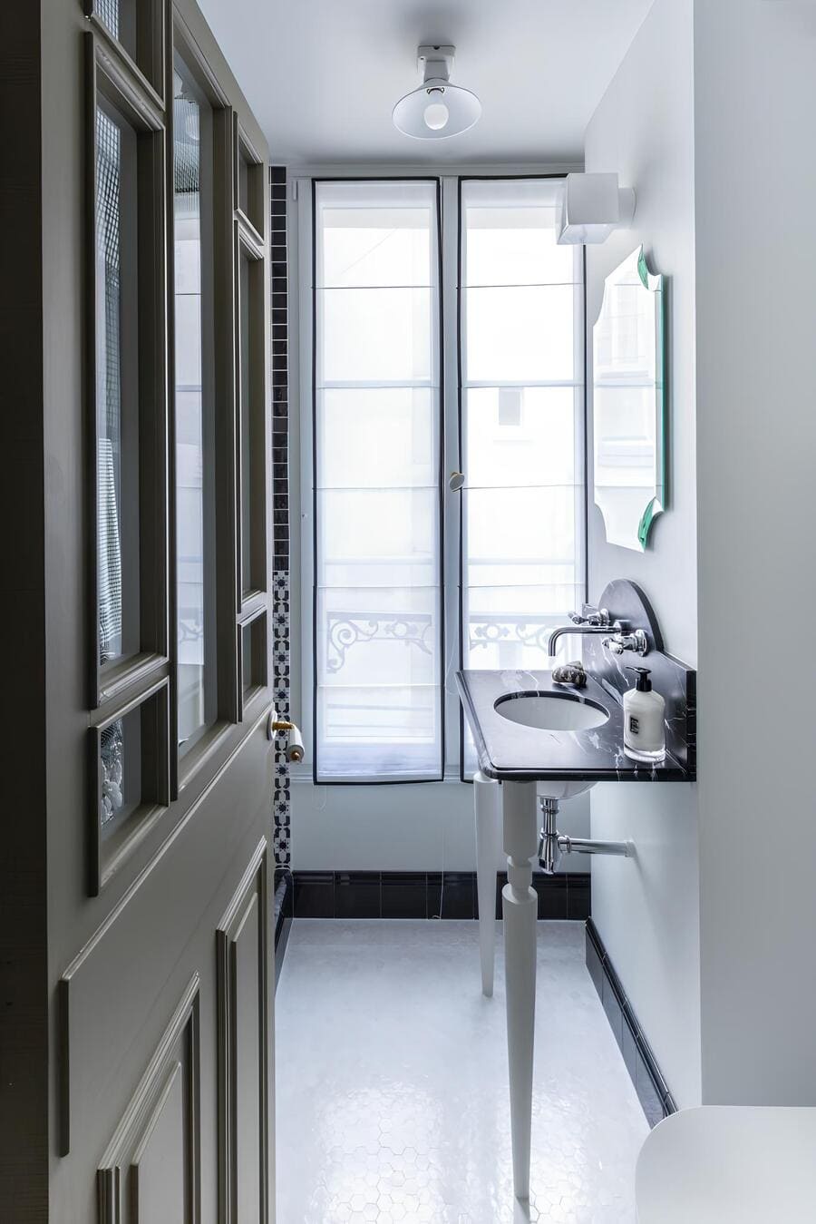 A petite but powerful focal point, the sink pairs a veined black marble counter with delicately turned legs, giving the compact bathroom the elegance of a freestanding console. Above it, a softly scalloped mirror adds a whisper of old-world glamour, reflecting light from the tall window and subtly expanding the narrow space.