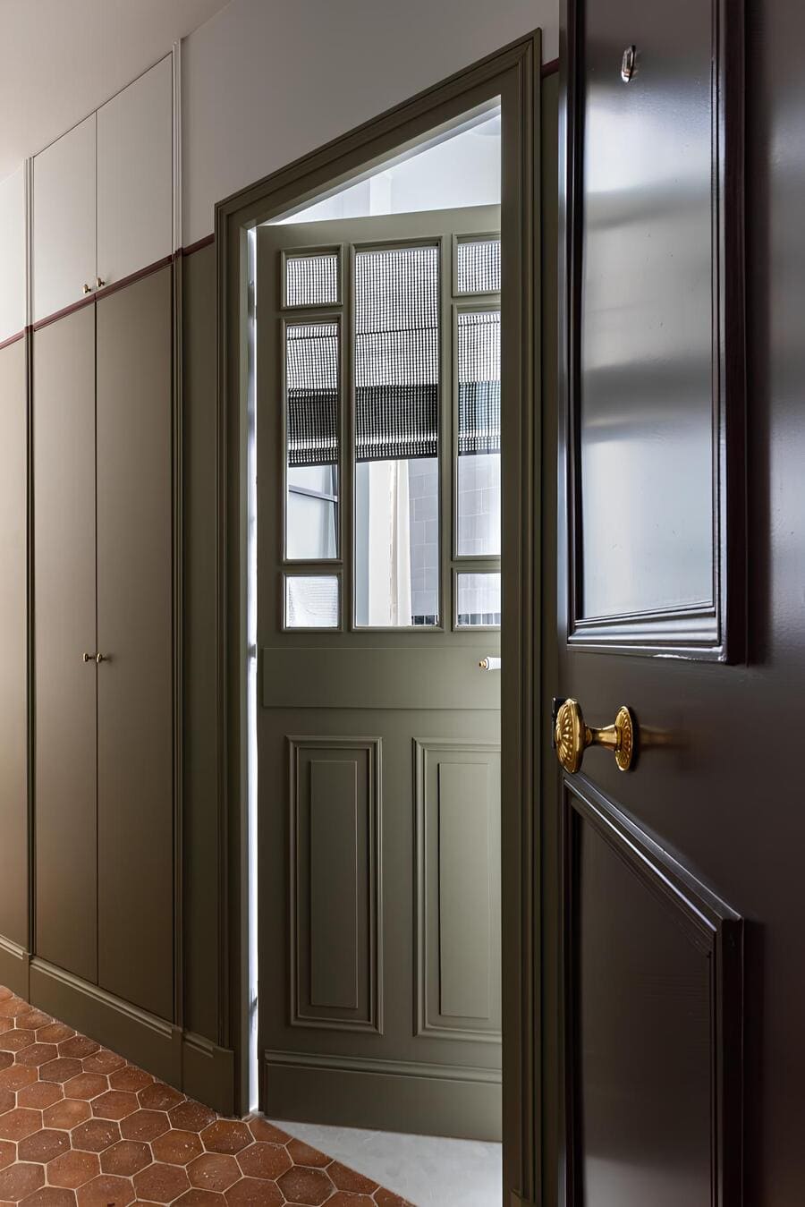 Painted in a deep olive-green tone with a gleaming brass knob, the entry sets the mood before you’ve fully stepped inside. Beyond it, paneling and tailored millwork line the corridor, punctuated by a fine red trim that quietly guides the eye.