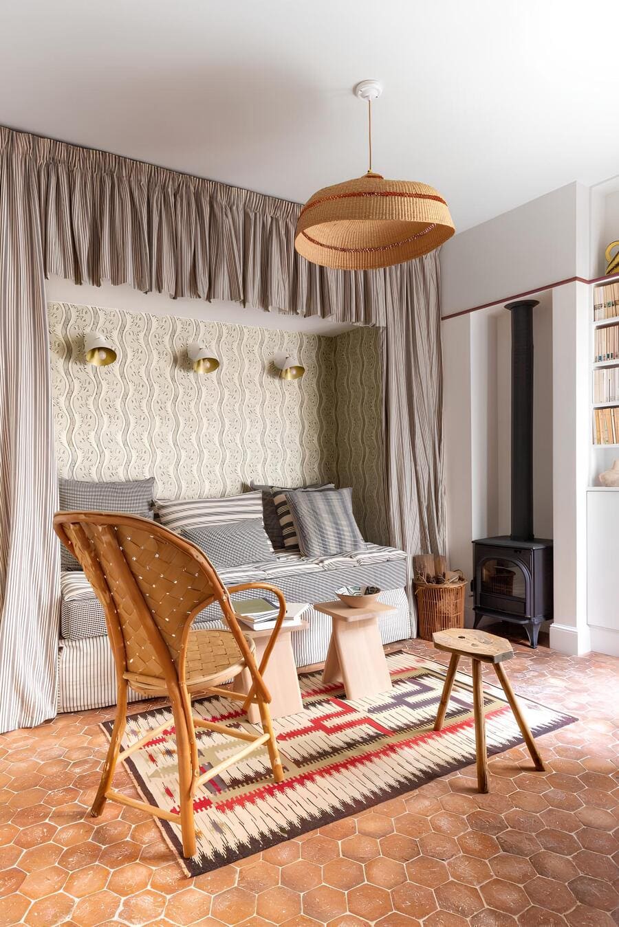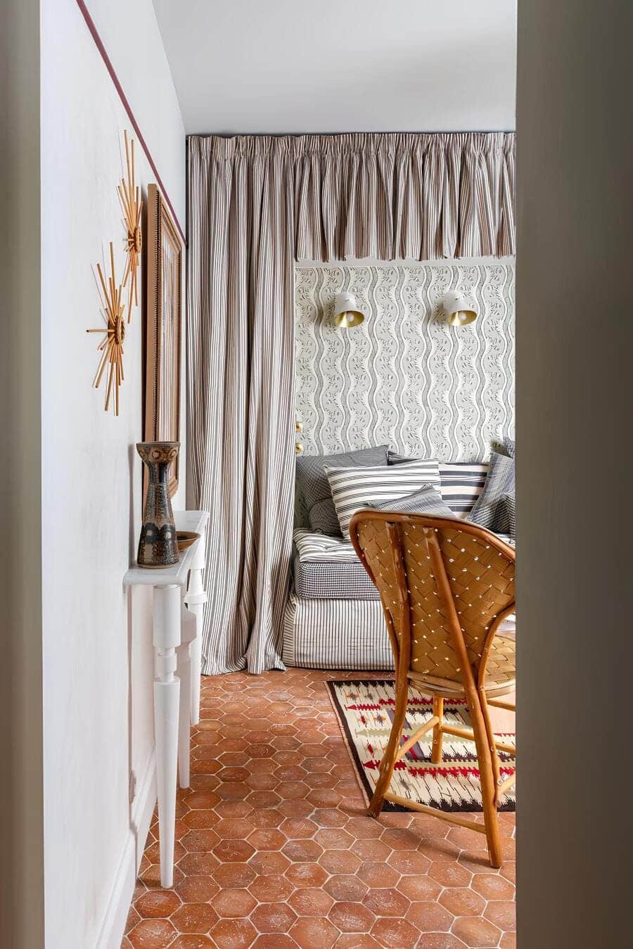 Terracotta hex tiles lead the eye inward, warming the space from the ground up, while a wicker chair by Le Corbusier and a woven kilim rug introduce texture and timeworn charm.