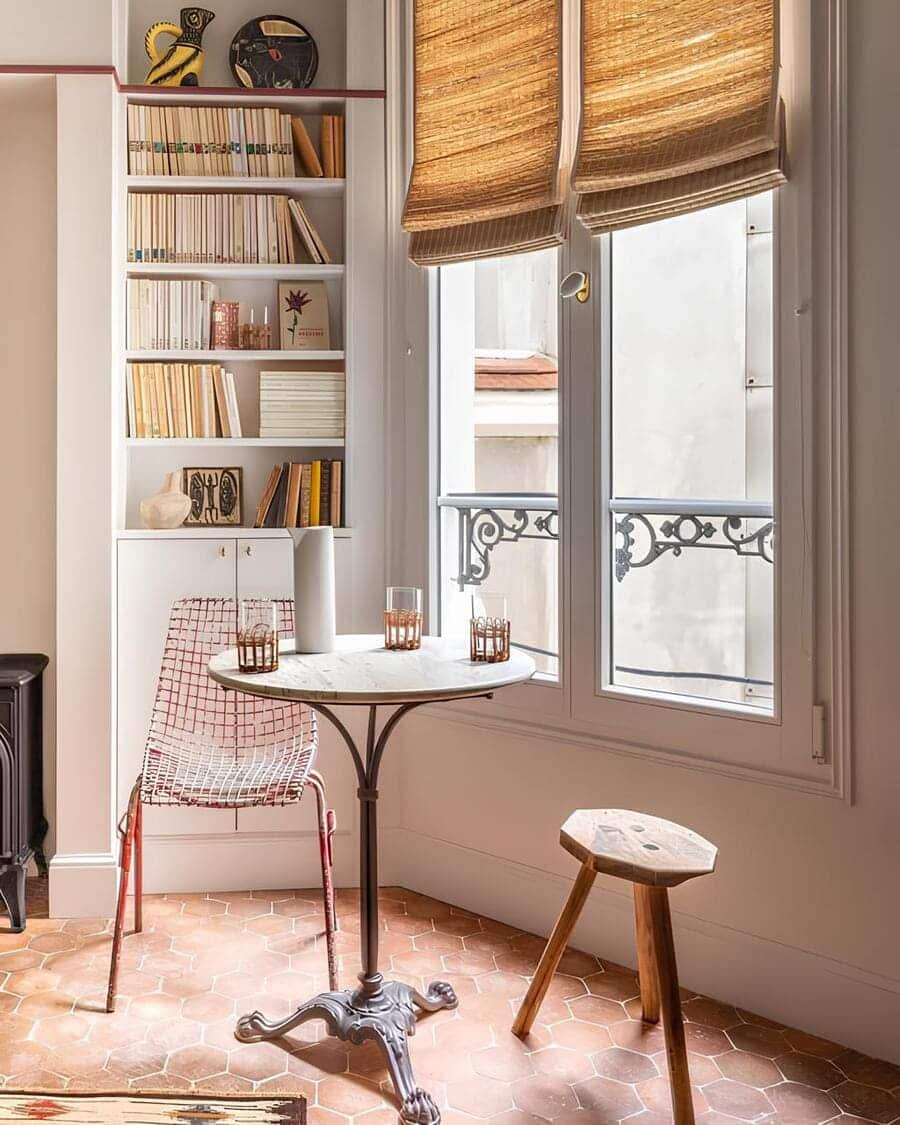 A classic bistro table with a marble top tucks neatly beside the window, catching the soft light filtered through woven Roman shades. It becomes a dining table, writing desk, and morning coffee spot — proof that even the smallest corner can hold a whole Parisian ritual.
