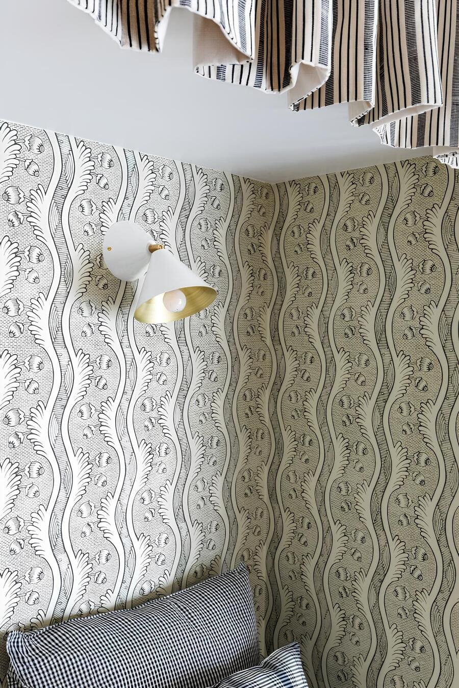 Above, striped curtains ripple softly at the ceiling line, while a petite wall sconce — white with a brushed brass interior — casts a warm, intimate glow.