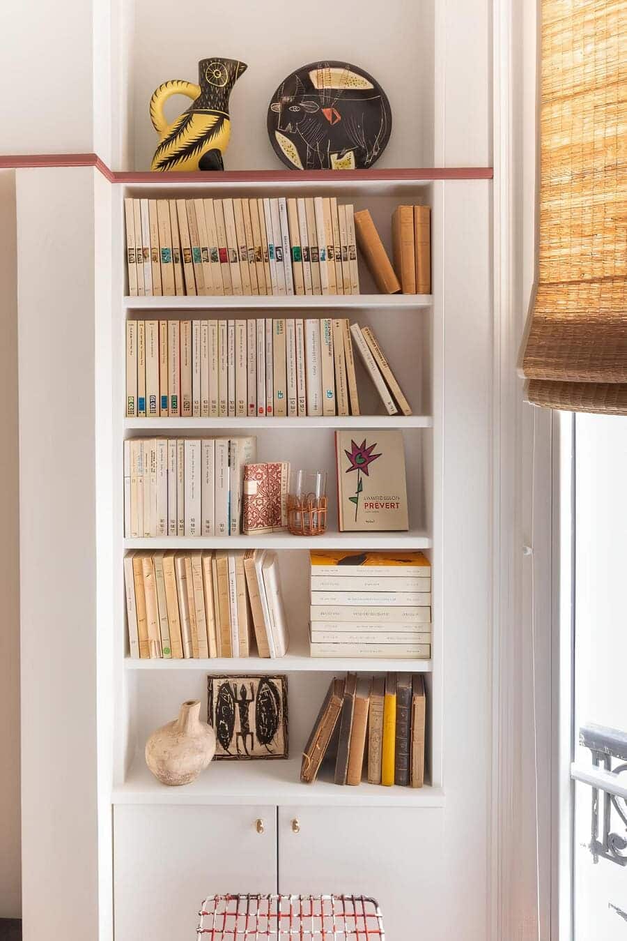 Tucked beside the window, the built-in shelves stretch upward, lined mostly in pale, time-softened spines — a quiet palette that keeps the tiny room feeling airy. Books are stacked both vertically and horizontally, mixed with ceramics, small artworks, and a pair of amber glasses waiting for apéritif hour.