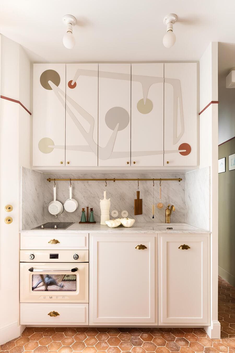 There was no possibility of separating the kitchen from the living area, so instead of fighting the layout, she embraced it. The kitchen cabinetry melts seamlessly into the room, its upper cupboards transformed into a fresco that reads more like art than storage. The color palette flows uninterrupted, allowing the eye to travel without hitting visual walls.