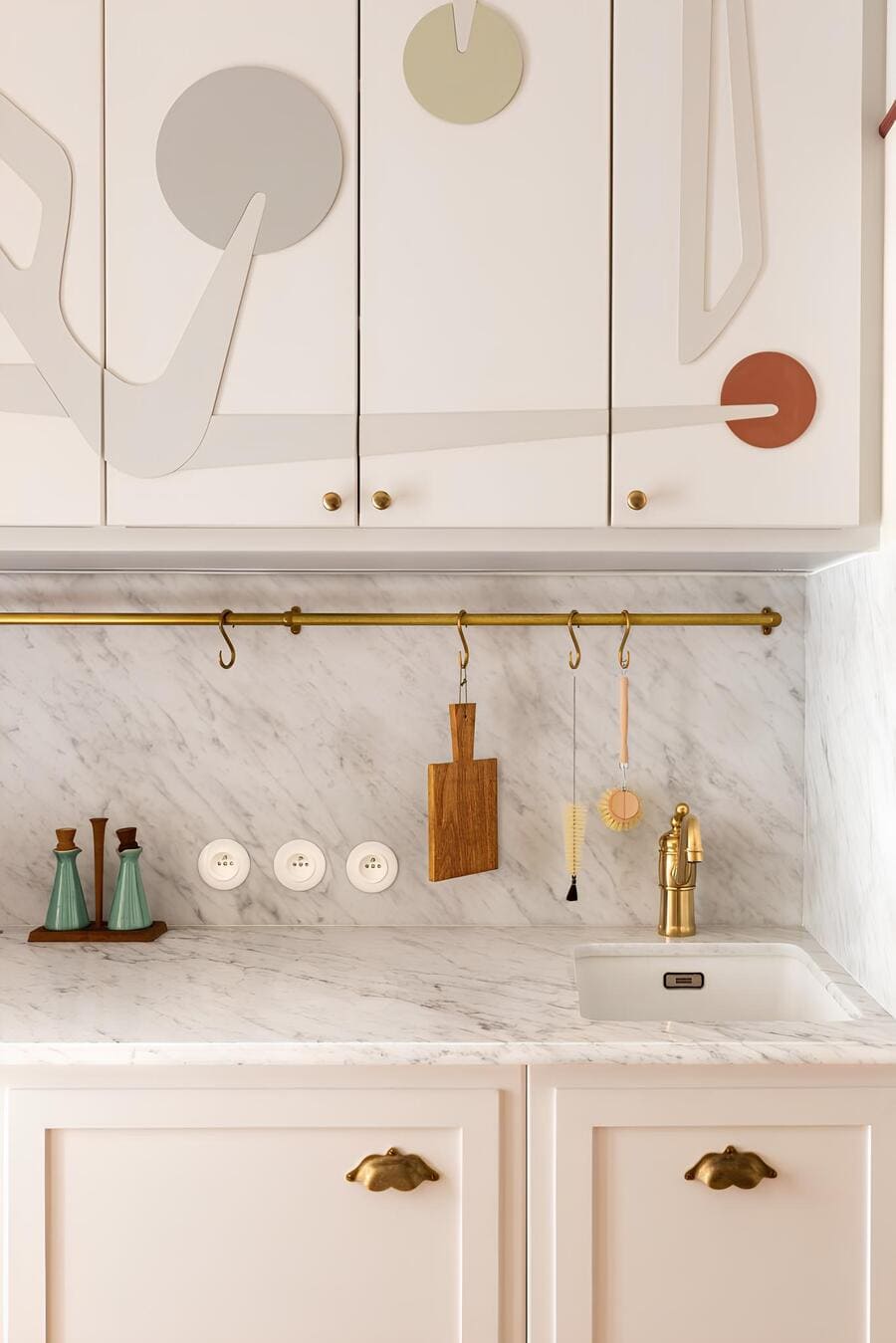 Round porcelain outlets punctuate the stone like subtle jewelry, while aged brass hardware and a sculptural tap add warmth against the pale cabinetry.
