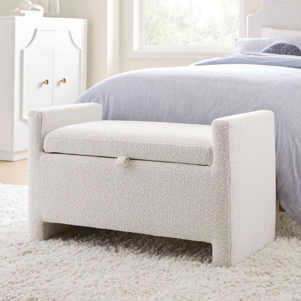 A white upholstered storage bench sits at the foot of a bed in a bright, modern bedroom with light-colored decor and a plush white rug.