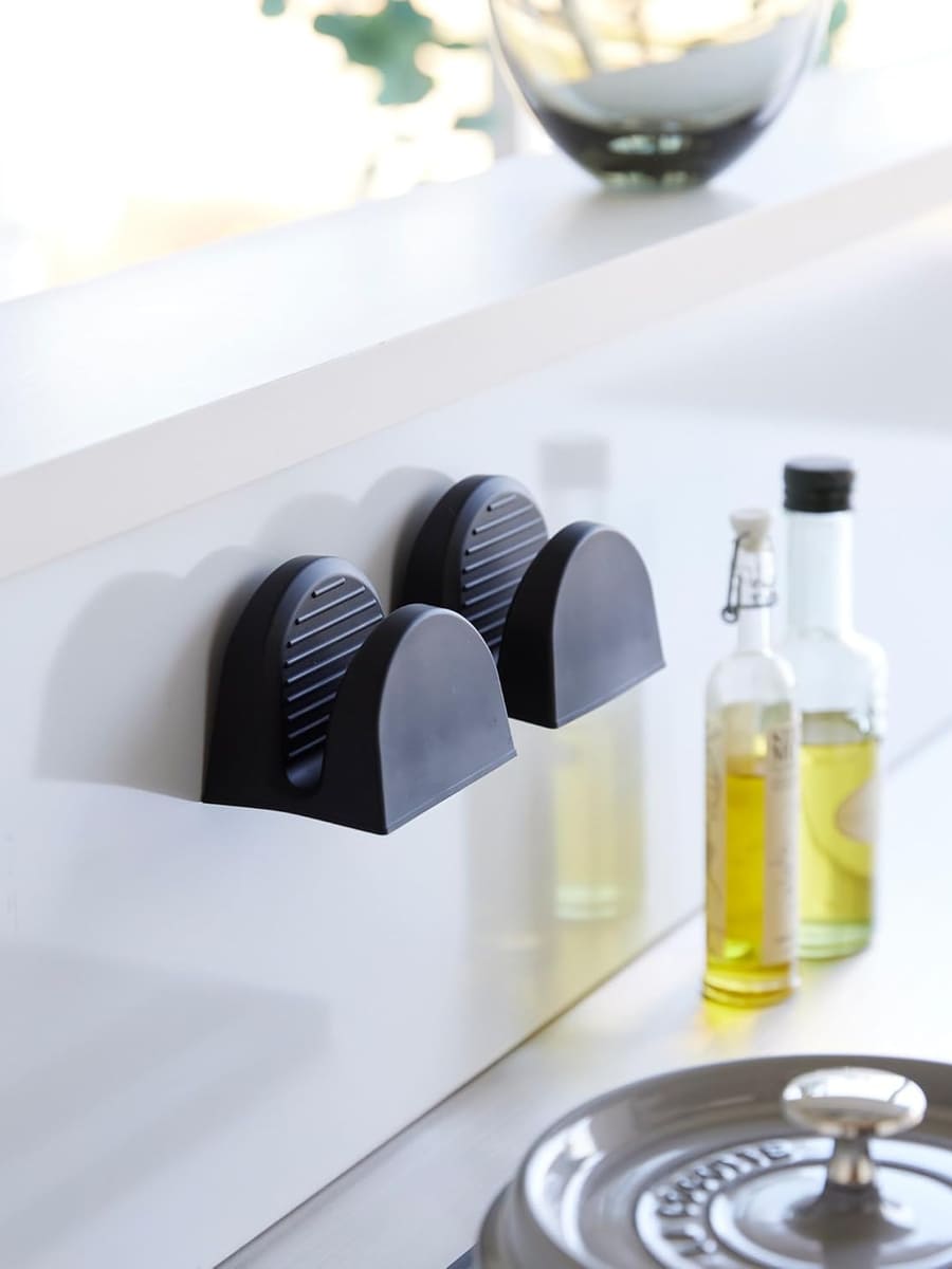 Pot holders always end up shoved in a drawer… until you’re holding a hot pan and can’t find them. These silicone mitts solve that by sticking to a magnetic surface—fridge, range hood, oven door—so they’re always right there when you need them. They’re heat-resistant, grippy, and satisfyingly low-profile, which is exactly what small kitchens require.