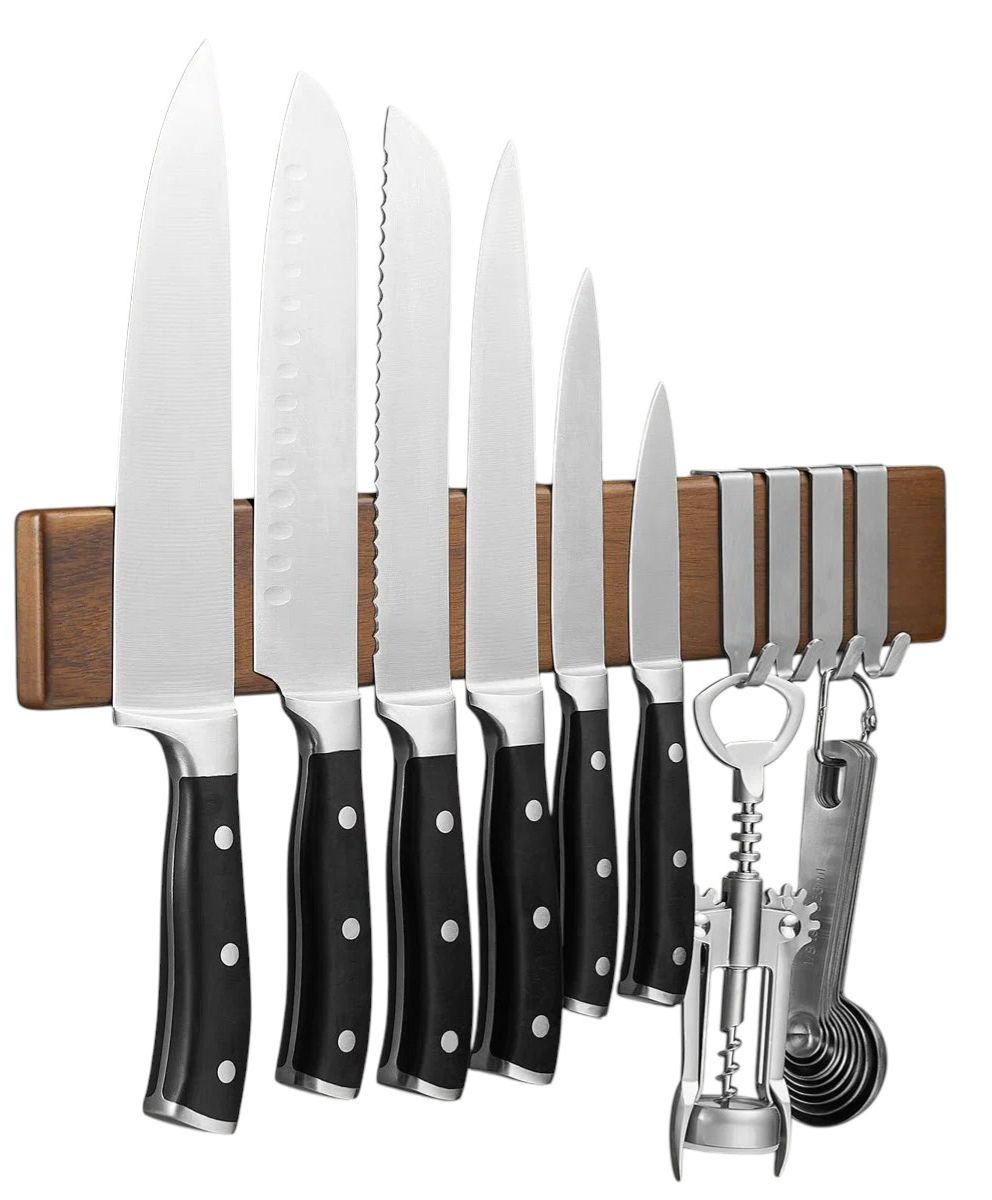 If your knife block is hogging the last sliver of counter you actually need, this magnetic strip is the kind of swap that immediately makes your kitchen feel calmer. The acacia wood reads warm and elevated (not workshop-y), while the full-length magnet keeps even heavier knives confidently in place. Bonus: the included hooks pull double duty for scissors, a corkscrew, or that one utensil you always dig for mid-recipe.