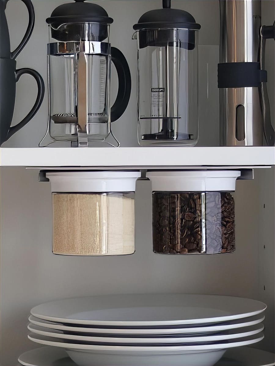 This is a true cheat-code move: it mounts under a shelf and gives you two jars that slide on and off magnetically—no twisting lids, no awkward tracks, just grab-and-go storage that still seals airtight. It’s perfect for coffee, tea, sweeteners, baking sprinkles, snacks, or vitamins—basically anything that’s currently living in half-open bags. If your counters are cramped, using the underside of shelves like this feels like you found extra square footage.