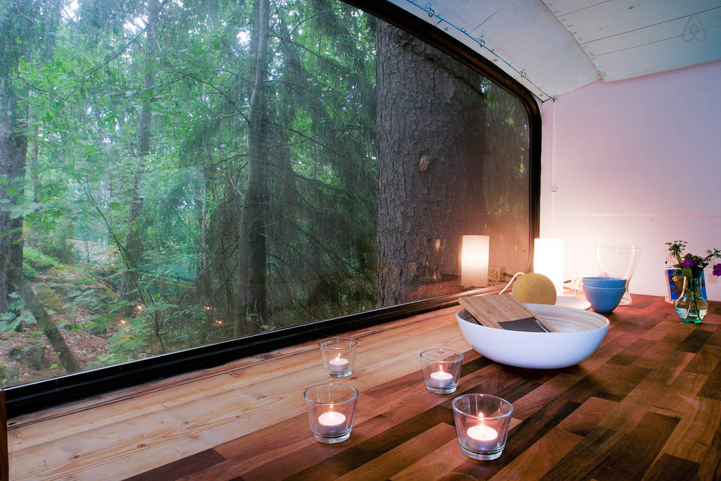 You find this amazing veteran bus from 1976 surrounded by the forest in a quiet part of the Swedish capital, Stockholm. The owners Jon and Stina had great fun renovating and transforming the old bus into a beautiful and comfortable living space. It’s situated by a vibrant vegetarian community “Vita Hästen” (White Horse) which was the inspiration for Lukas Moodysson movie, “Together.” Within walking distance is the lake Kyrksjön and Stockholms oldest building, Bromma church.