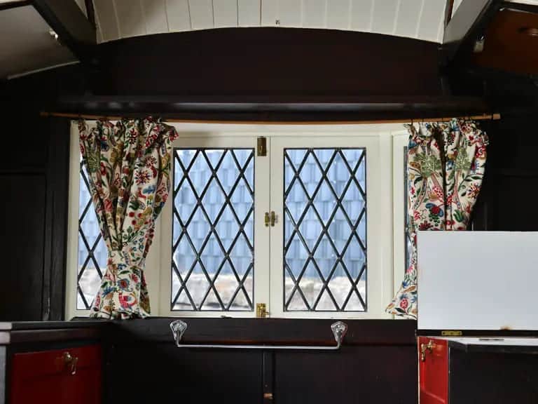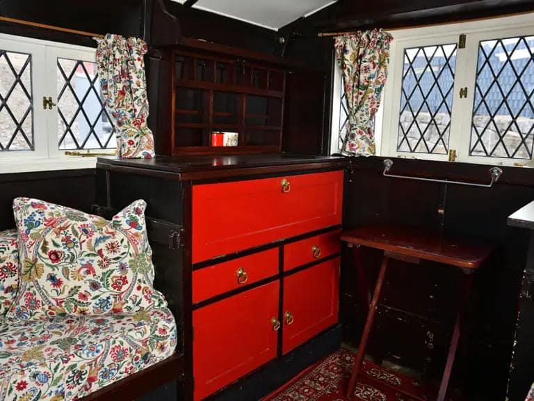 Inspired by Tudor and Jacobean architecture, the caravan features a distinctive lantern-style roof, charming bay windows, and leaded glass that feels more country manor than campsite. It’s no coincidence that another example of the Jacobean now resides in the National Motor Museum—this model represents the pinnacle of early caravan design.
