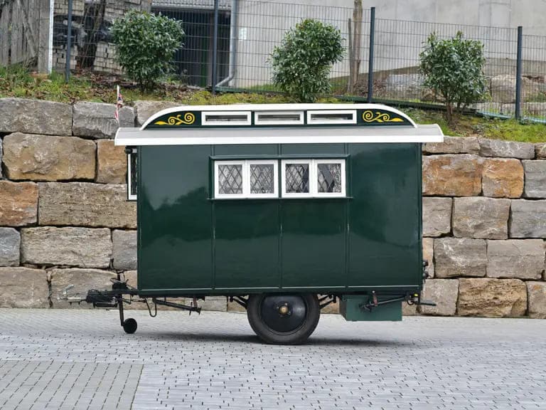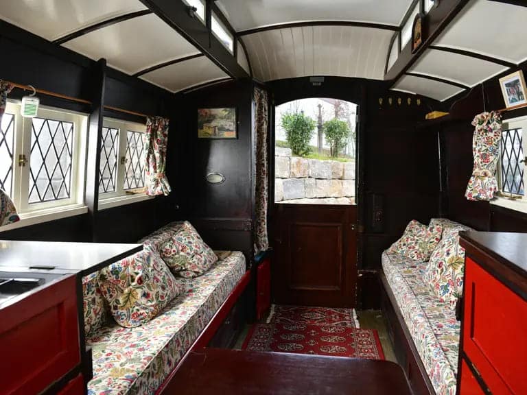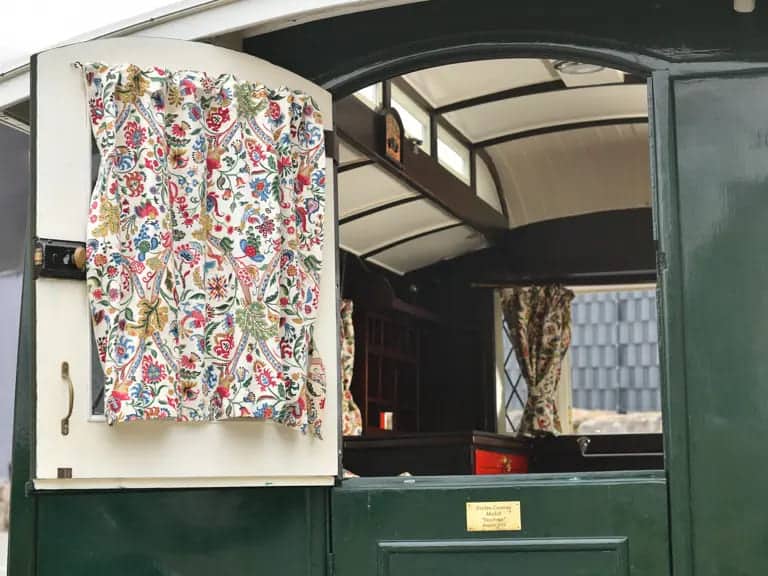 Finished externally in dark green with crisp white trim, the caravan’s interior is nothing short of enchanting.