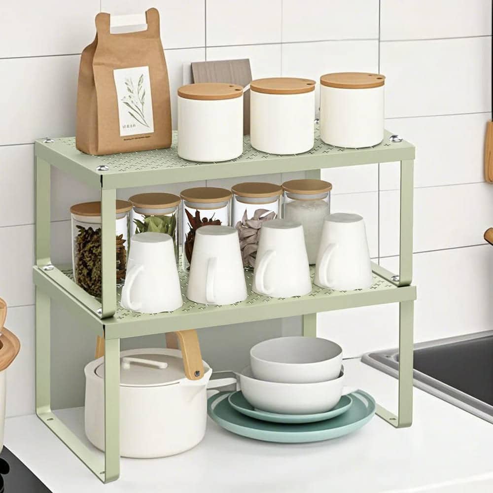 Double your cupboard space instantly with these tiered shelves—perfect for dishes, jars, or creating a neat little coffee nook.