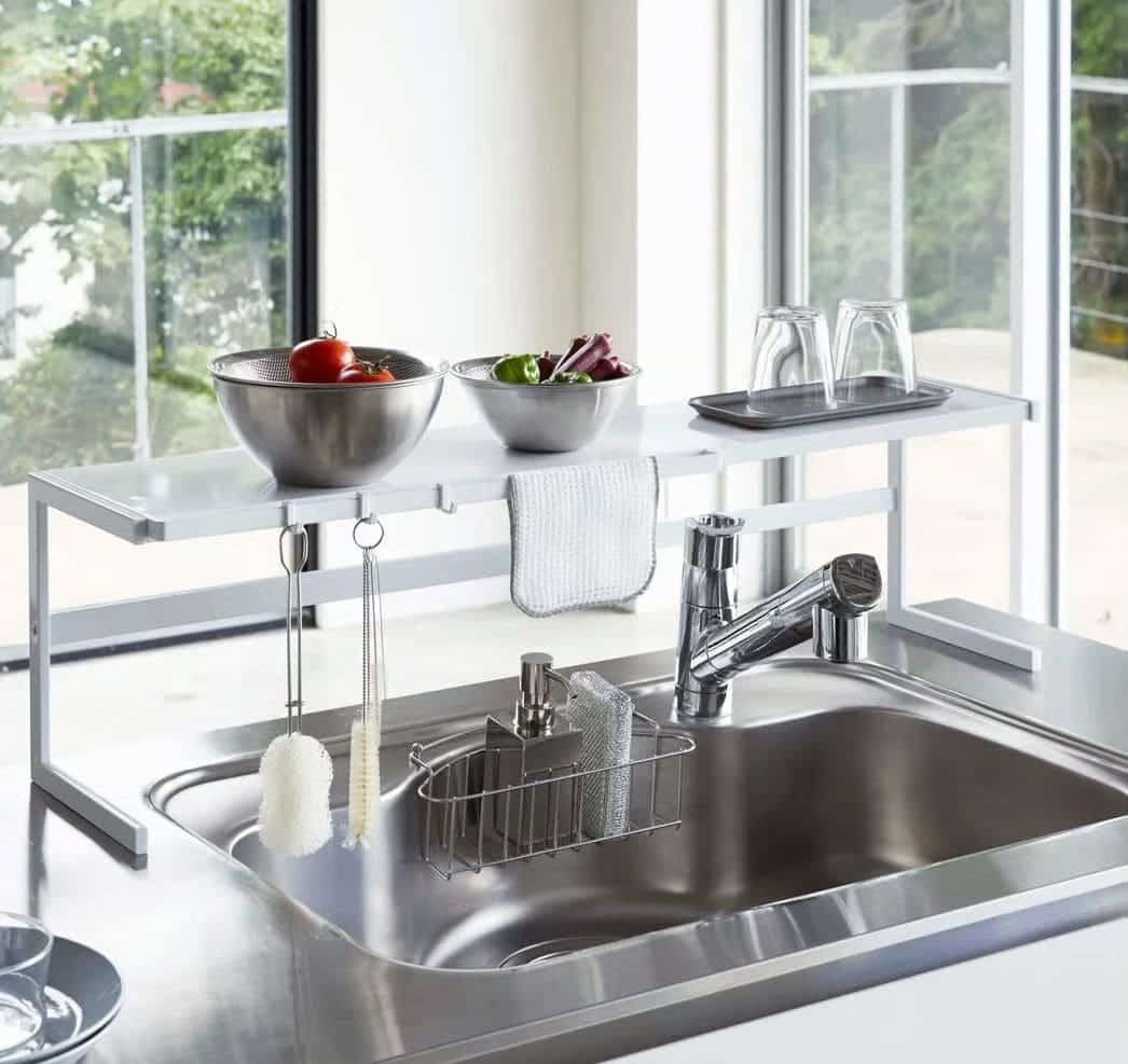 A powerhouse over-the-sink rack with space for plates, bowls, knives, and even wine glasses. Its stainless steel frame resists rust, and the adjustable design lets you create a custom setup that works for your kitchen. Think of it as combining your dish rack and open shelving into one smart, space-saving station—perfect for small kitchens that need every inch to work double duty.