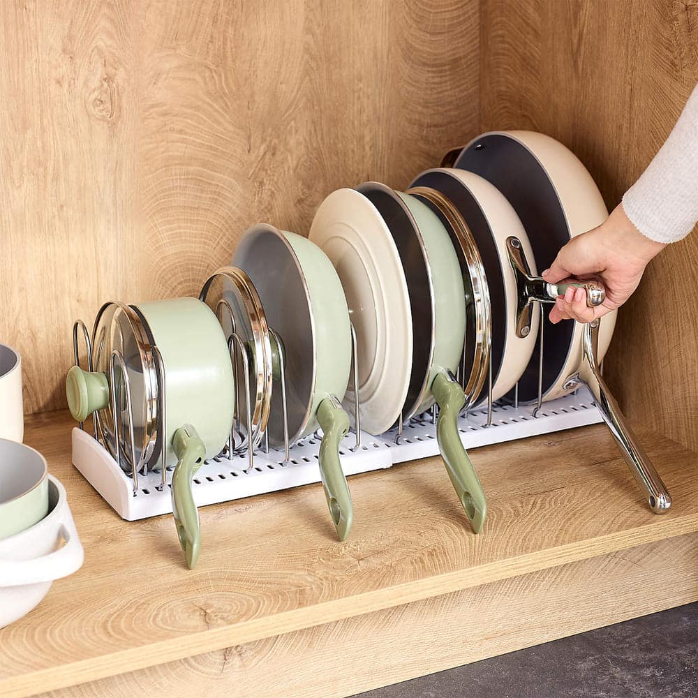 Say goodbye to clattering stacks of pans. This adjustable rack keeps cookware upright, organized, and instantly grab-and-go.