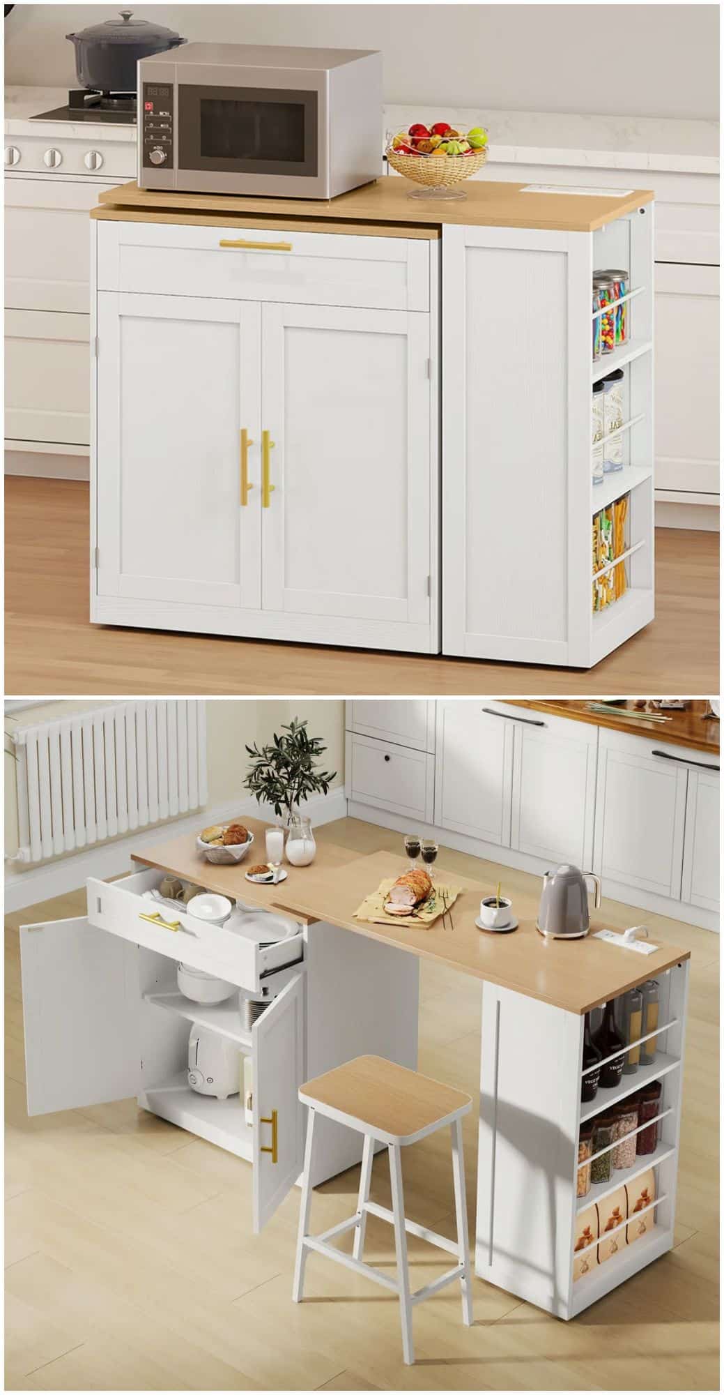 This rolling island transforms into a dining table, has a built-in charging dock, and even comes with two stools. Small space, meet big functionality.