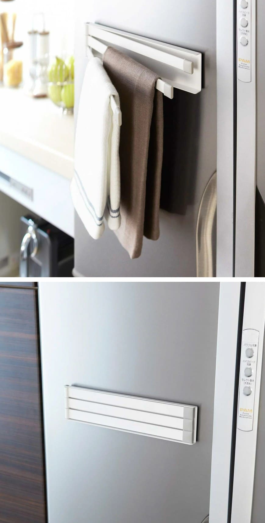 A magnetic towel rack that clings to your fridge or any metal surface, freeing up drawer space for things that actually need to be hidden away.